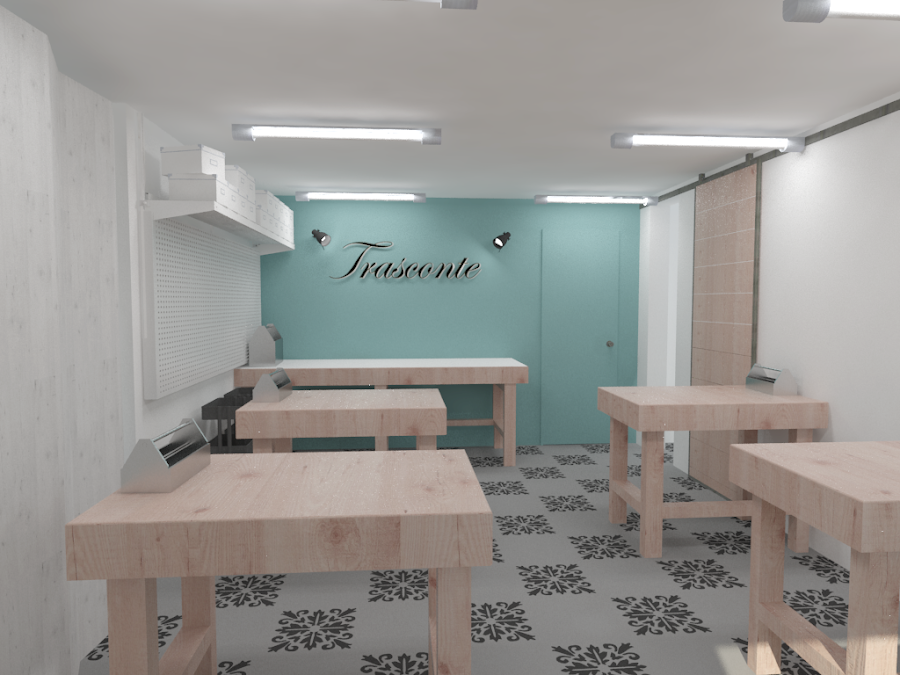La zona de alumnas, para un máximo de cinco personas. Grupos pequeños para un mayor entendimiento y cercanía. Mesas altas y fuertes donde poder apoyar piezas pesadas con buena iluminación artificial porque las clases se darán en la tarde-noche.