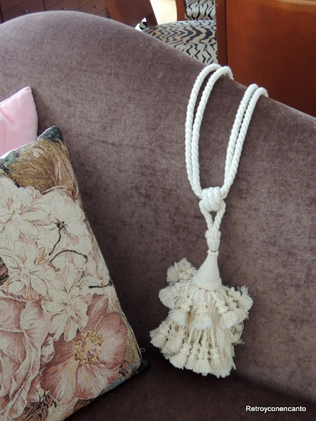 Pero entonces recordamos un alzapaños de una antigua cortina que descansaba junto a ella en una caja en el trastero... Una vez rescatado de su destierro, lo fuimos colocando por la casa, aquí, allá... Y en ningún sitio nos decía nada. Cuando esto nos pasa, dejamos las cosas en barbecho; las ponemos en algún sitio bien visible durante días hasta que salte la chispa o la inspiración (hay veces que esto no ocurre, claro...)