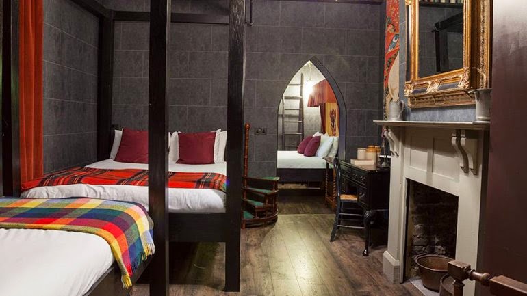 Las habitaciones inspiradas en el colegio Hogwarts, camas con dosel, baúles, libros de hechizos, varitas mágicas...