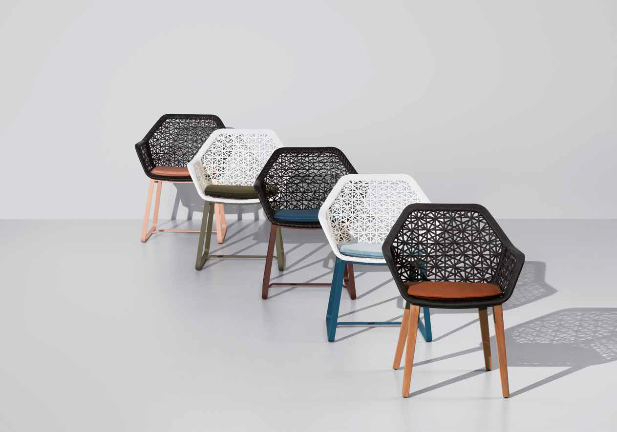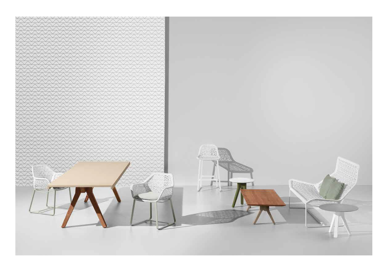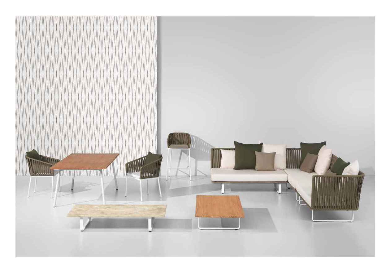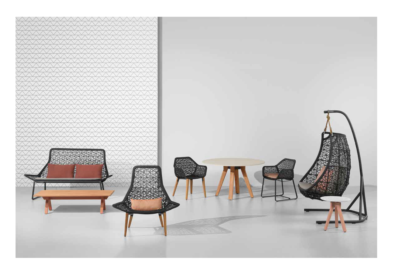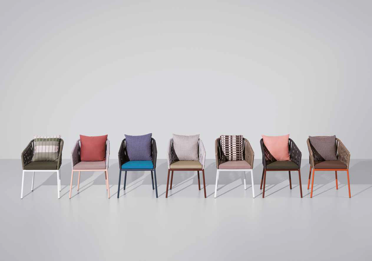 Cala may be used for outdoor dining as well as a chair to lounge in. The wide selection of met al coatings, rope colours and cushion fabrics offer many possibilities to tailor the identity of the chair to suit different projects.