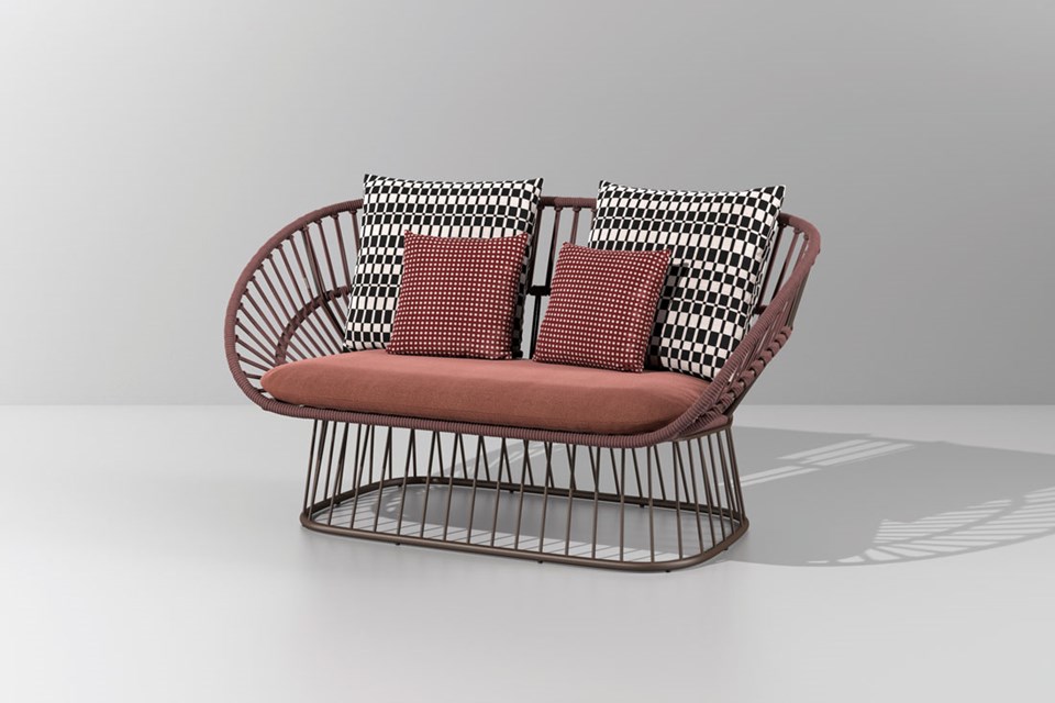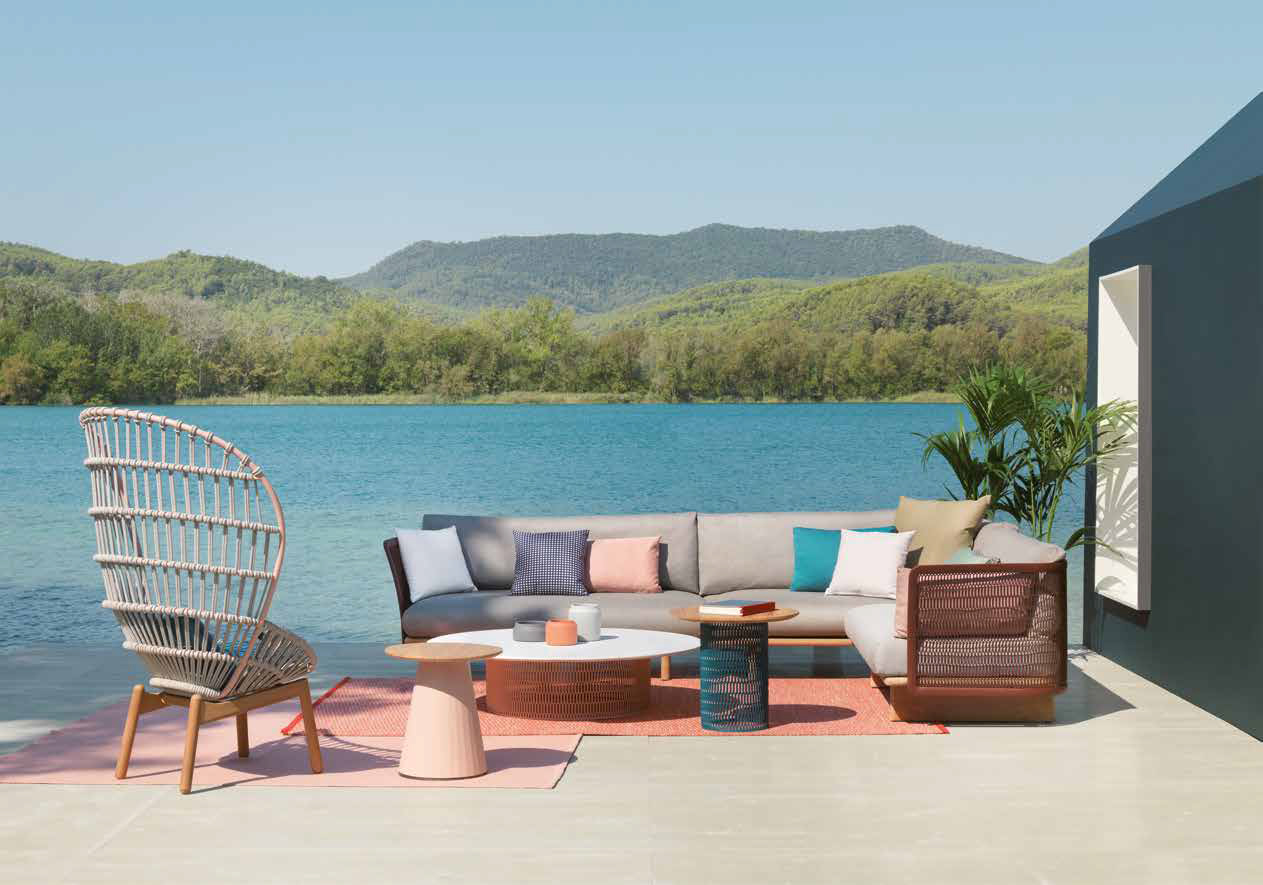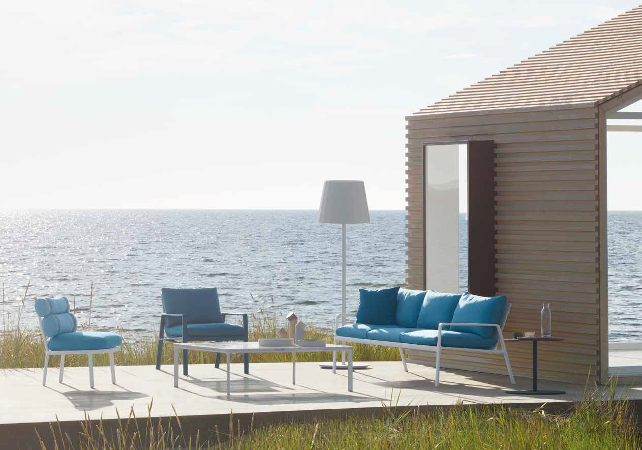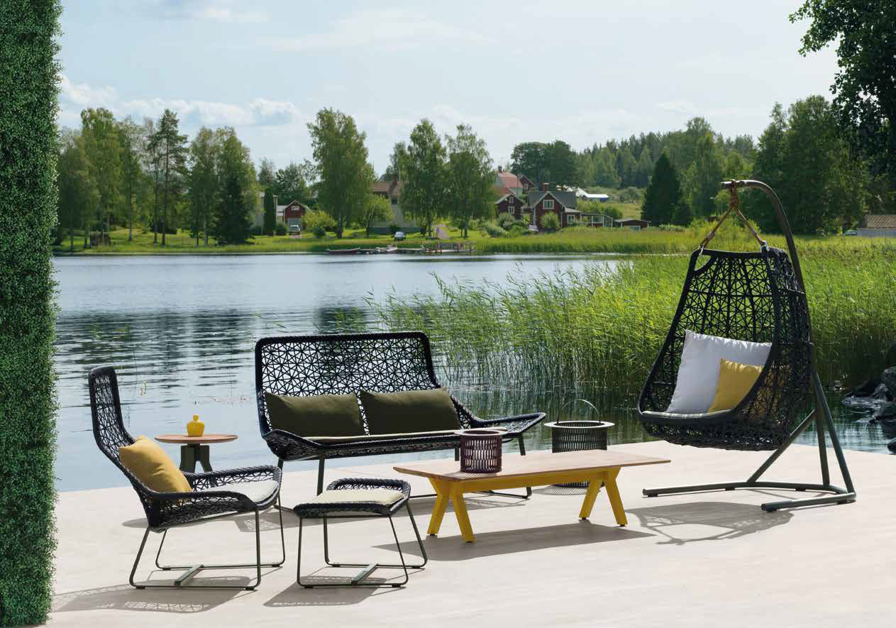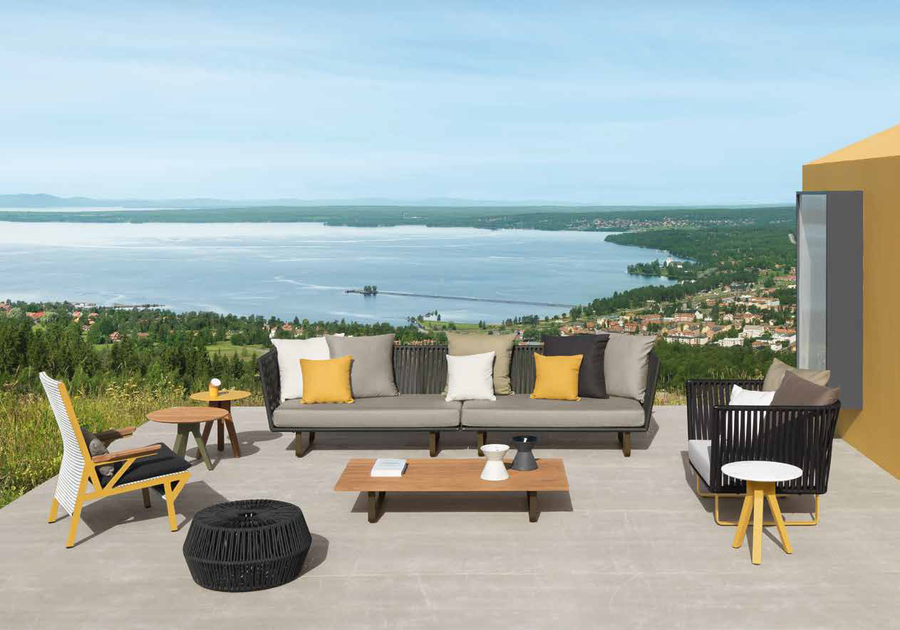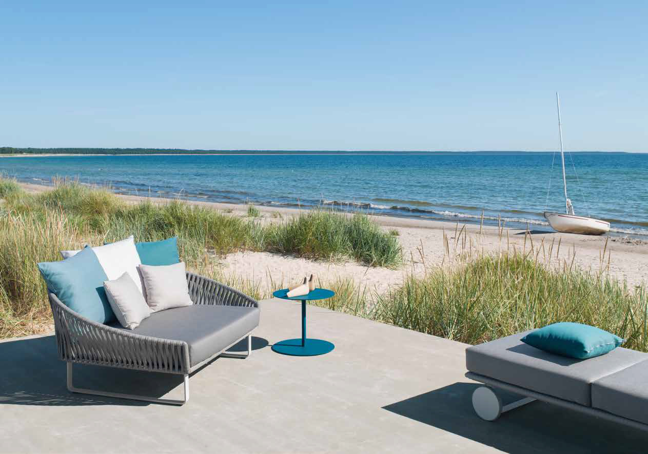 Cala may be used for outdoor dining as well as a chair to lounge in. The wide selection of met al coatings, rope colours and cushion fabrics offer many possibilities to tailor the identity of the chair to suit different projects.