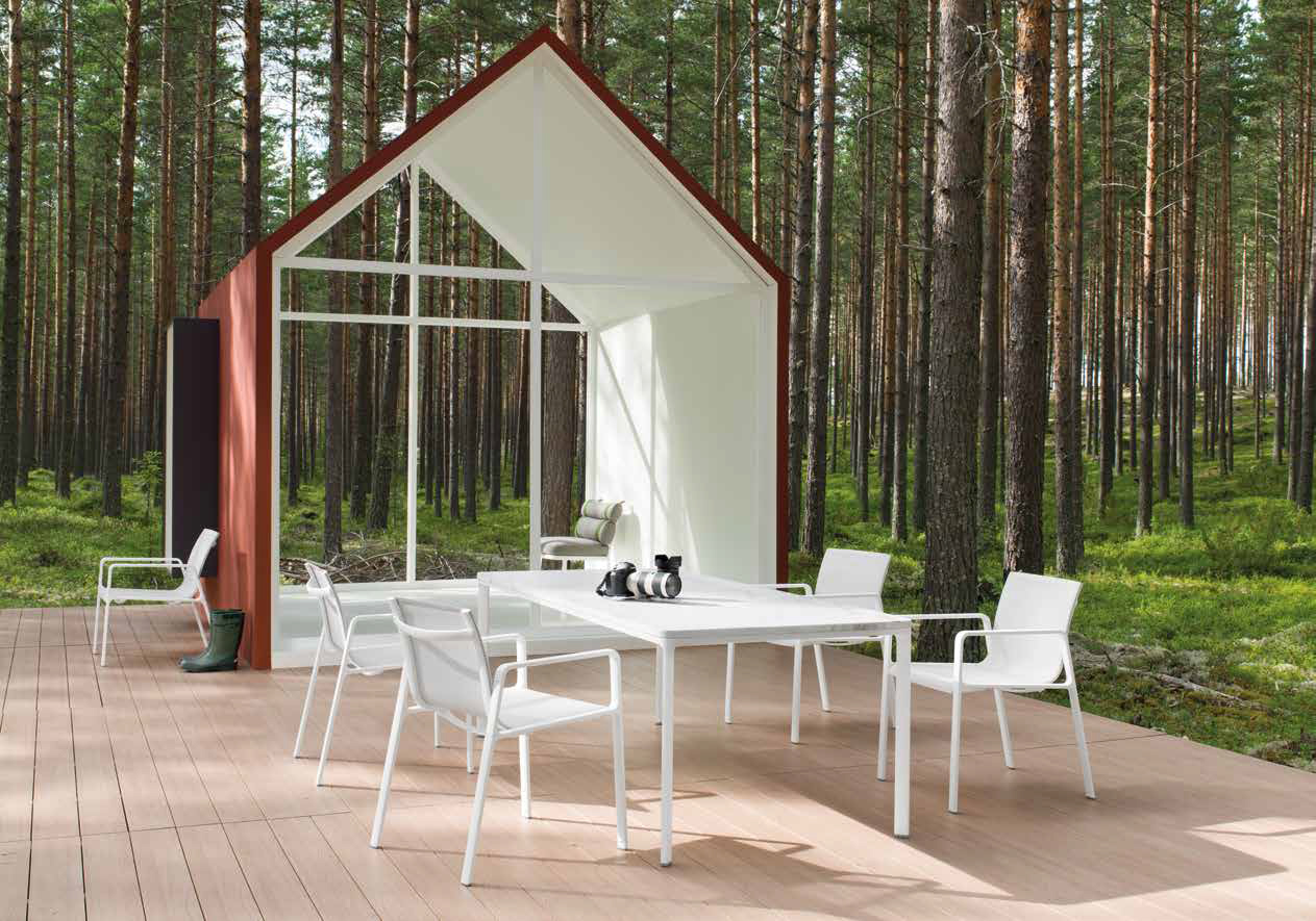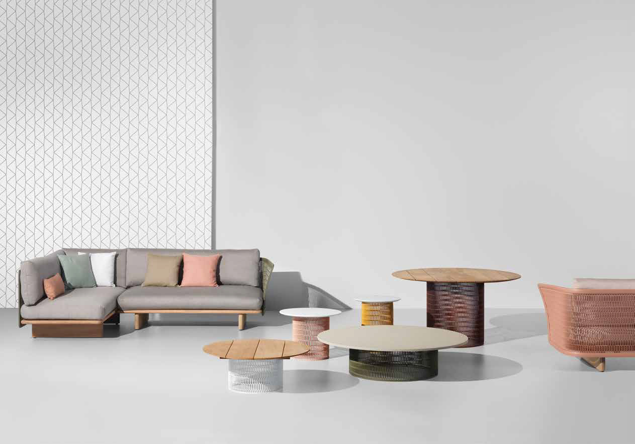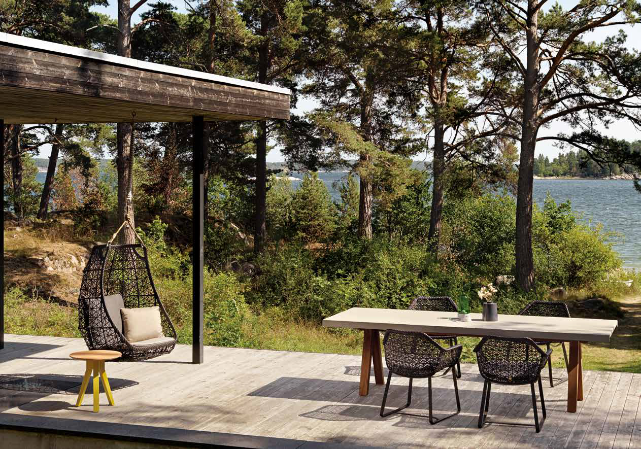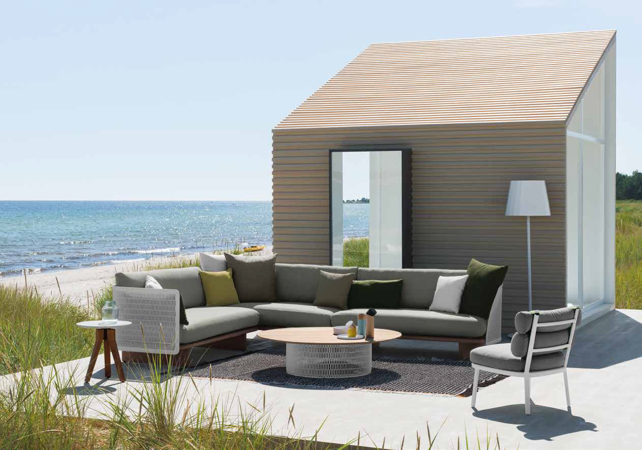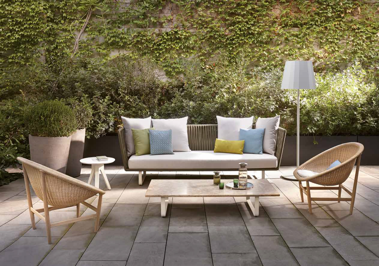 Cala may be used for outdoor dining as well as a chair to lounge in. The wide selection of met al coatings, rope colours and cushion fabrics offer many possibilities to tailor the identity of the chair to suit different projects.