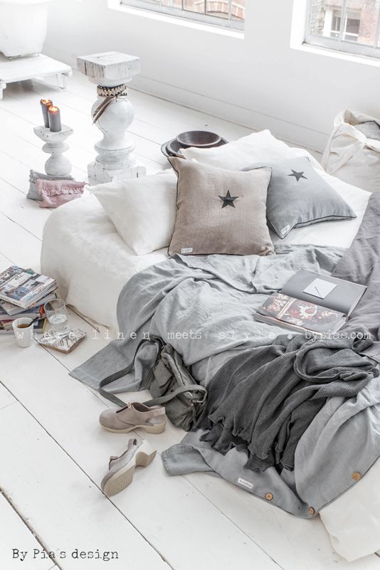 Colores en grises o antracitas mezclados con colores pasteles, blancos o beige..., y recuerda que en el lino la arruga es bella, aprenderás a aceptarlas tal cual.