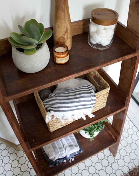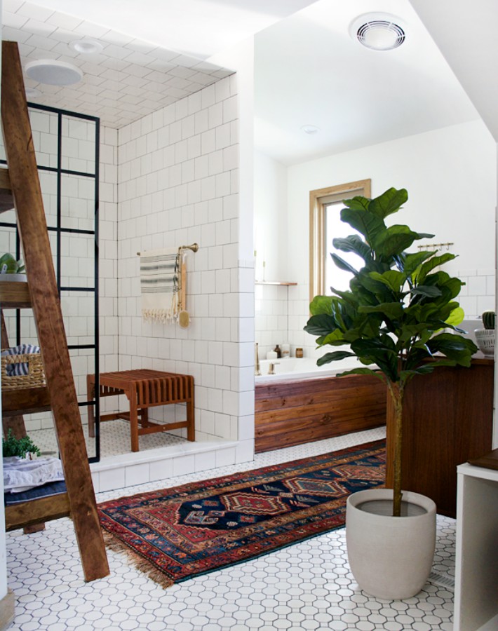 La madera también la encontramos en la balda sobre la bañera o la práctica escalera estante.