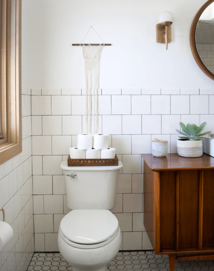 En cuanto a lo meramente decorativo, los textiles aportan también ese estilo retro-vintage tan de moda. Una toalla con flecos, un colgante de macramé sobre el inodoro, un cestillo para el papel higiénico.........