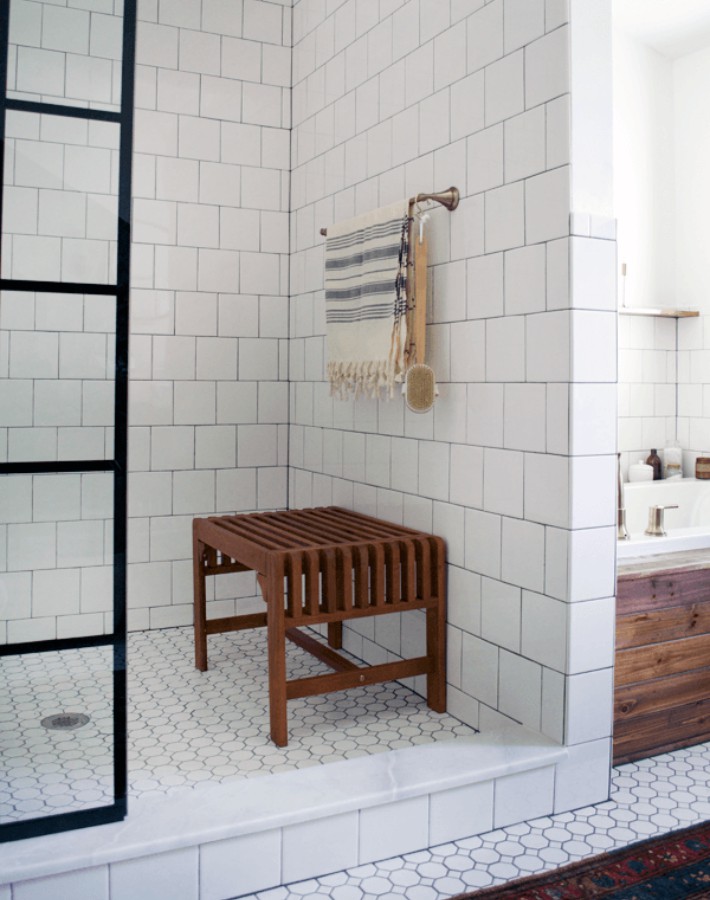 Revestida de azulejo completamente, techo incluido un gran rociador, un asiento de madera, repisas y el maravilloso cerramiento de acero negro y cristal ¡No me puede gustar más!