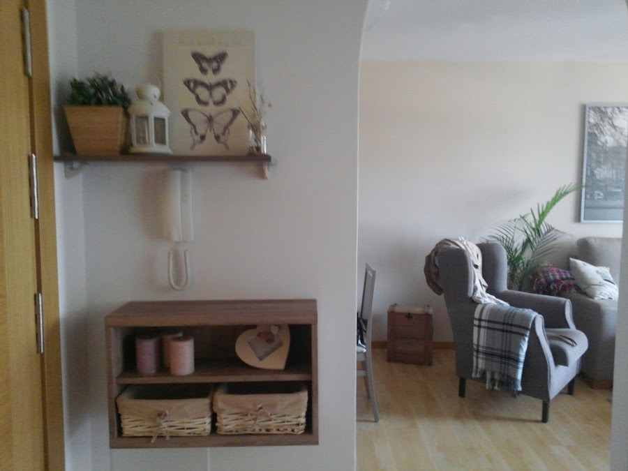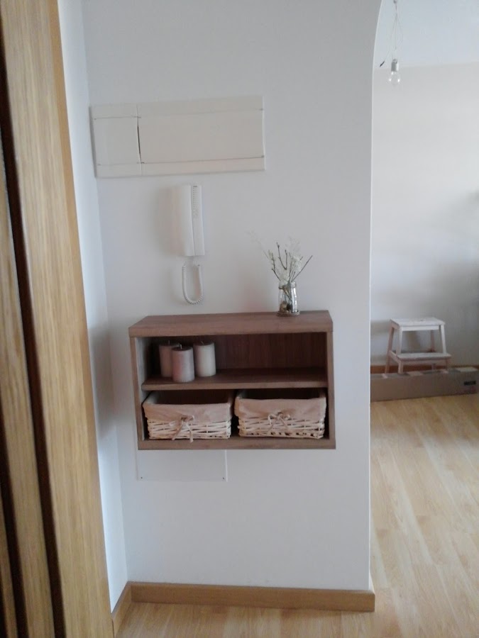 Como podéis ver, es un hall mas bien pequeñito, en el que el principal problema era la situación del cuadro de luces y el telefonillo. Como el hacer obra para cambiar de sitio el telefonillo no era una opción, tuve que ingeniármelas para adaptar unos muebles bonitos y baratos en el espacio reducido que me quedaba.