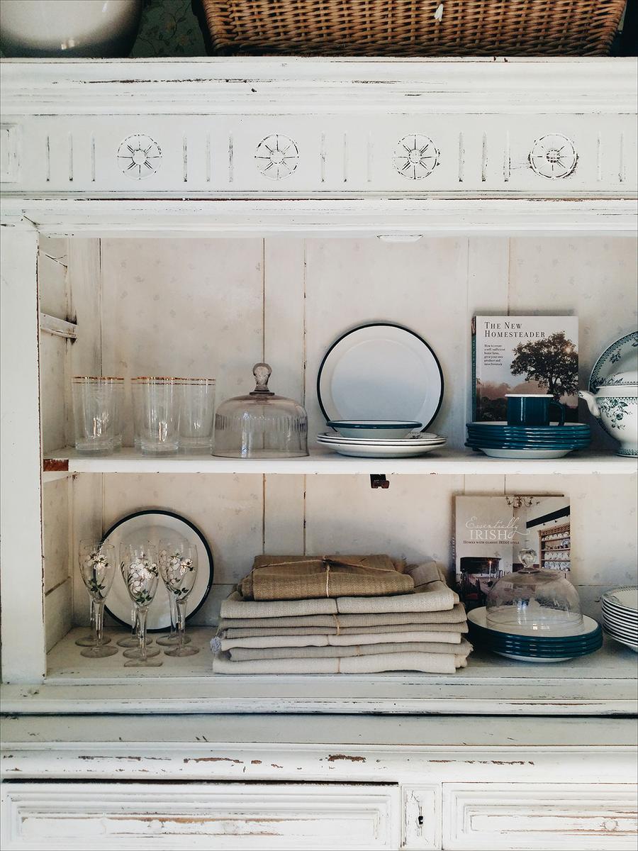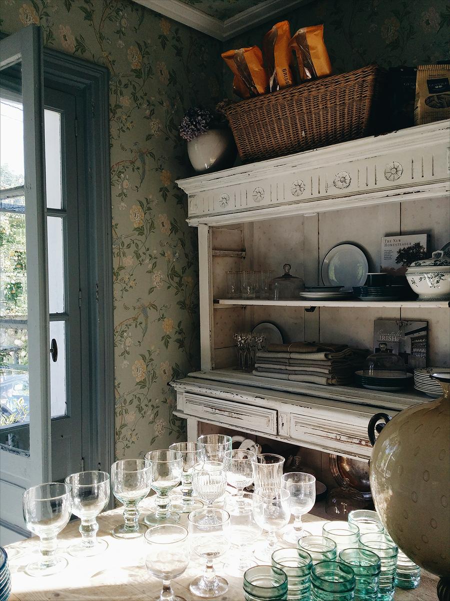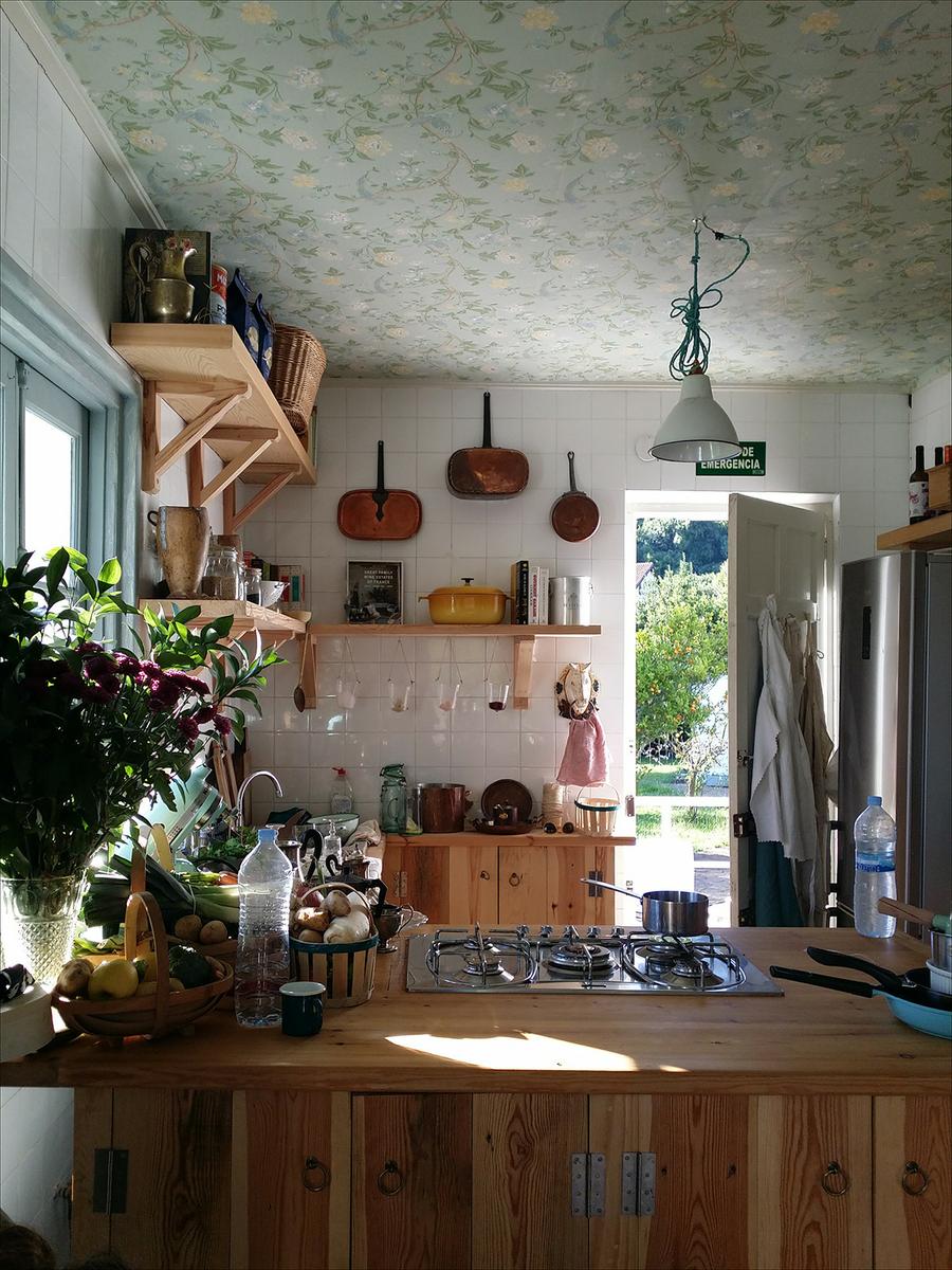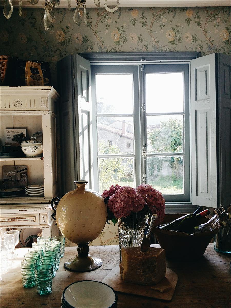 Por la izquierda, la cocina comedor. De ensueño. Es todo belleza. Desde la luz que entra por las ventanas, hasta las paredes revestidas con los papeles de Laura Ashley y los colores de Auténtico Chalk Paint, pasando por cada detalle, cada paño, cada vaso, cada aplique y cada pieza de mobiliario. No hay una sola composición, un solo rincón de esta casa, que no sea una obra de arte en sí misma.