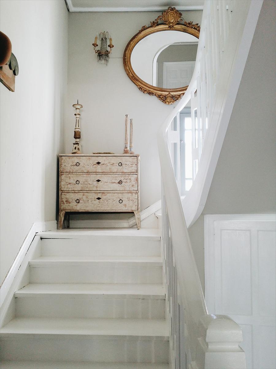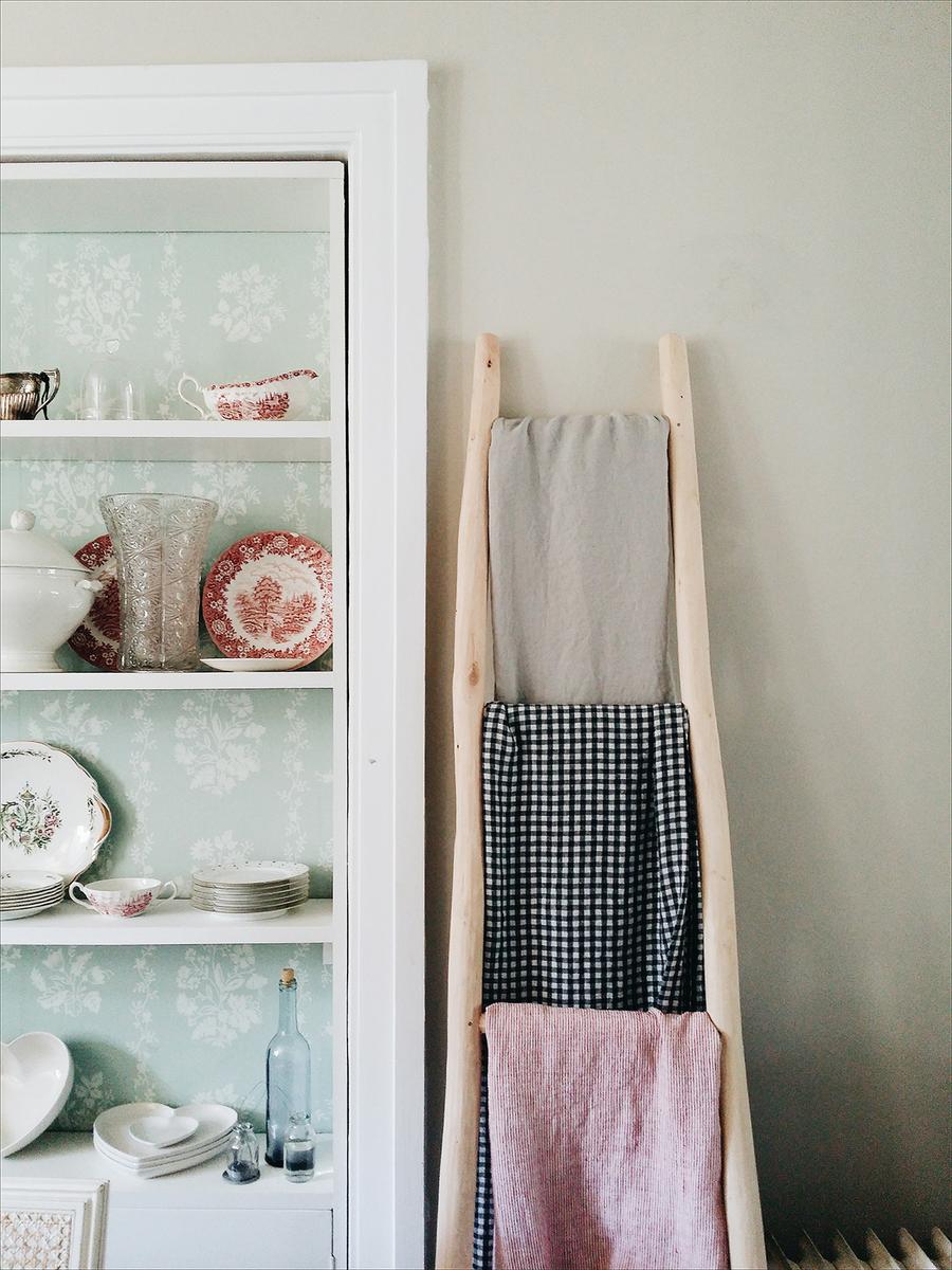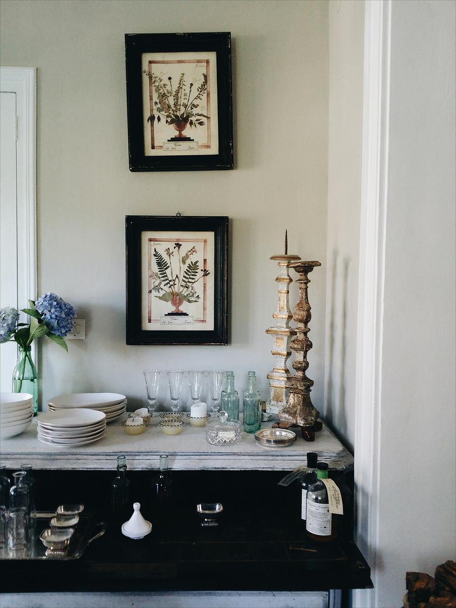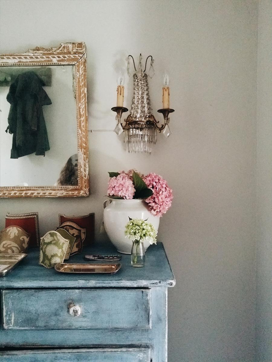 Por la izquierda, la cocina comedor. De ensueño. Es todo belleza. Desde la luz que entra por las ventanas, hasta las paredes revestidas con los papeles de Laura Ashley y los colores de Auténtico Chalk Paint, pasando por cada detalle, cada paño, cada vaso, cada aplique y cada pieza de mobiliario. No hay una sola composición, un solo rincón de esta casa, que no sea una obra de arte en sí misma.