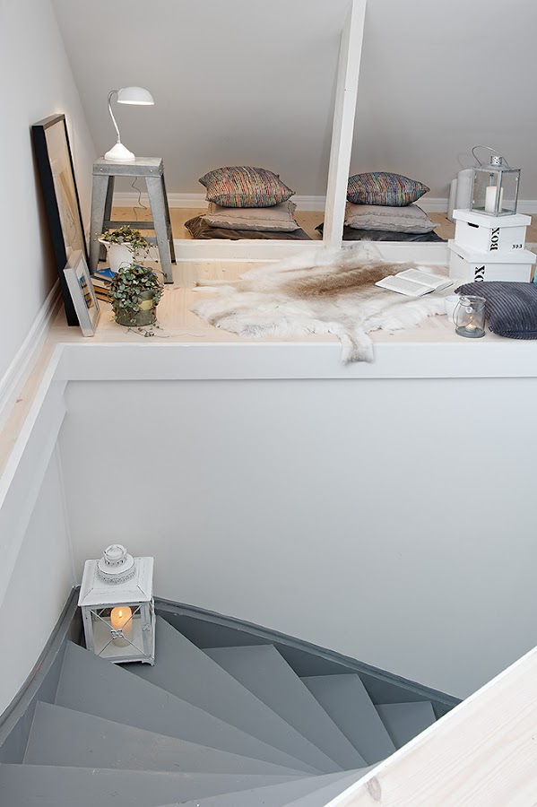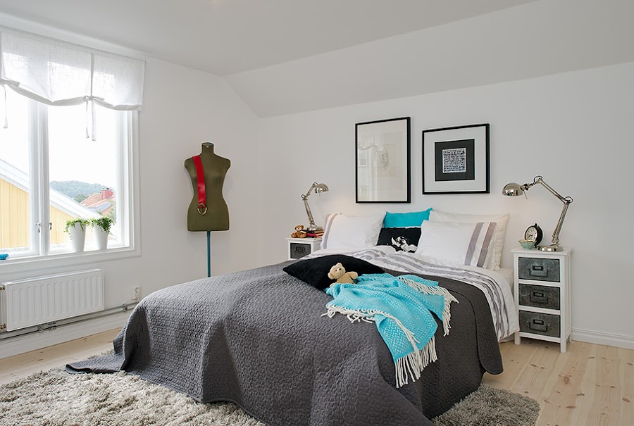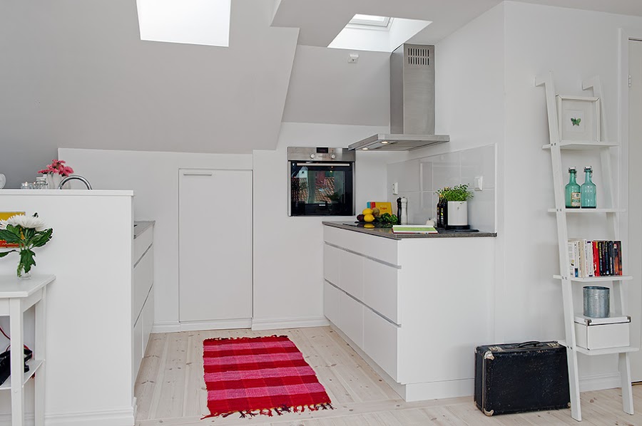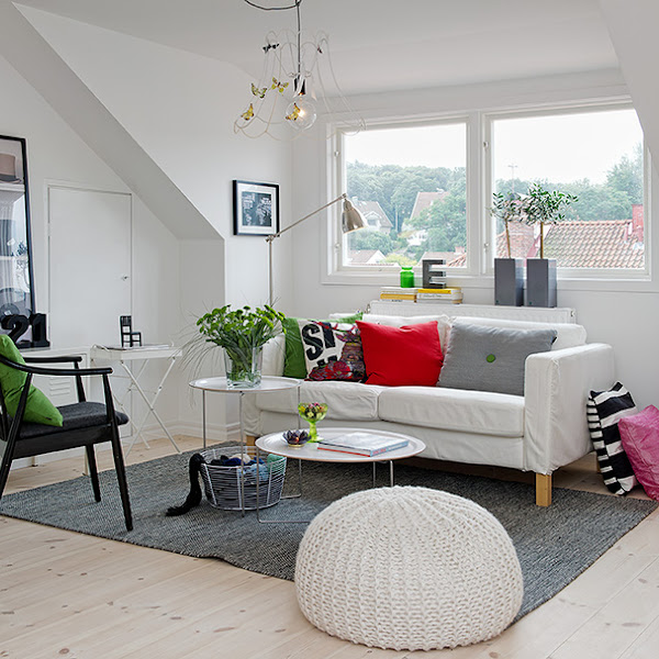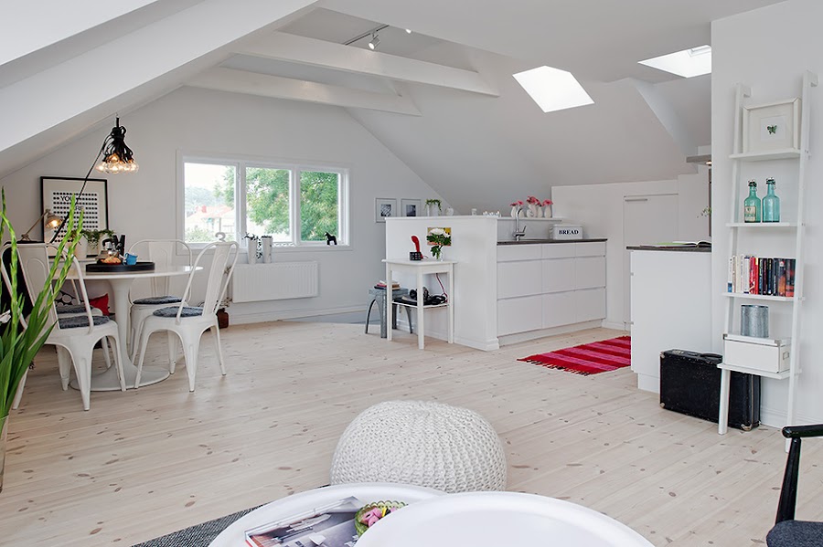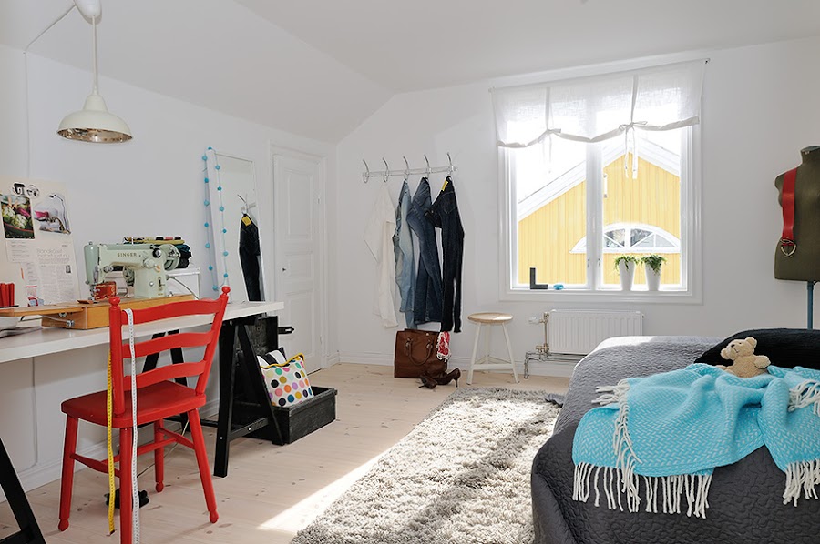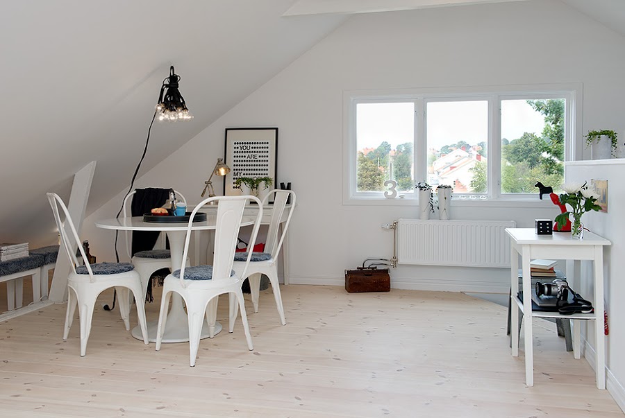 El piso es un apartamento tipo loft, de 55m2 y prácticamente diáfano, tanto su mobiliario como sus textiles pertenecen en la mayoria a Ikea. Mezcla perfectamente mobiliario metálico e industrial pero, siguiendo una base blanca y dejando el color en los complementos así, como algunas piezas recicladas llenando cada uno de sus rincones de mucha personalidad.