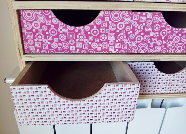 Por darle un poco de color, he forrado la parte delantera de cada cajón con tela adhesiva de la marca Dailylike.