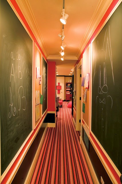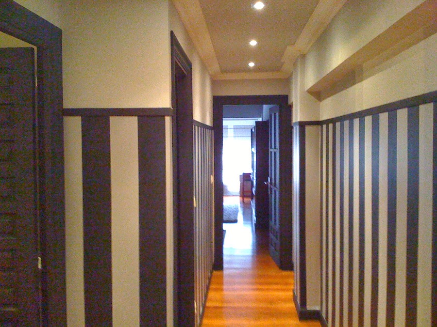 Pintar las paredes con rayas horizontales bastante anchas también nos puede ayudar, pero lo que seguro nos hará tener la sensación de tener el pasillo más ancho es sin duda pones una larga alfombra de rayas perpendiculares a la pared más larga.