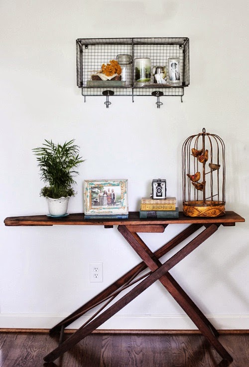 Una idea realmente original es reutilizar una antigua tabla de planchar para darle un aire vintage a nuestra entrada.