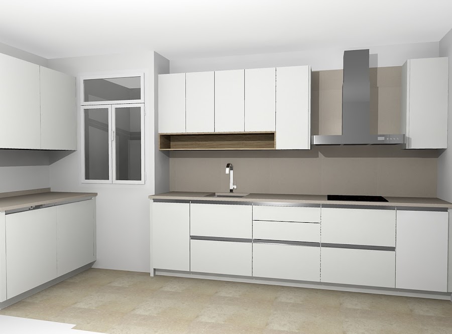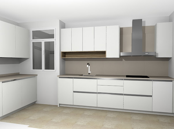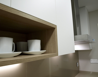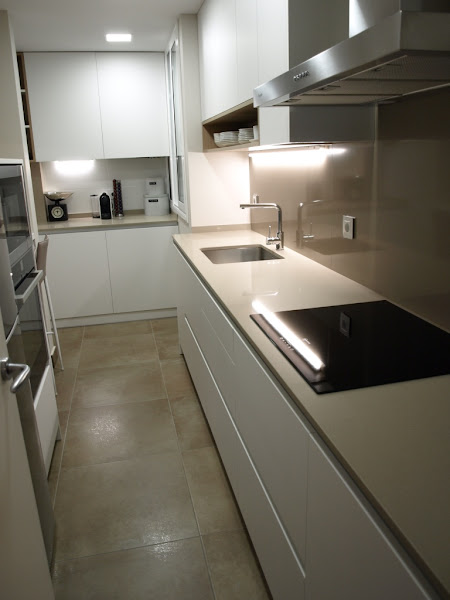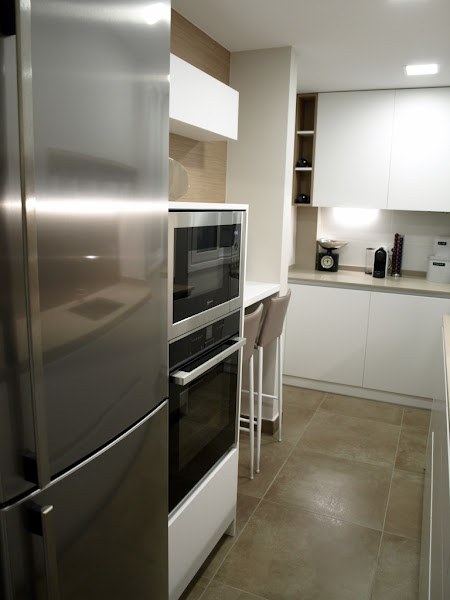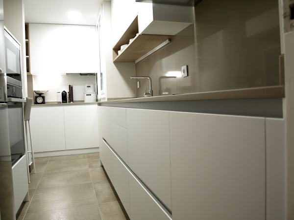 Para el mobiliario se utilizó el acabado Luxe Metaldeco blanco, con perfil gola. Con esta opción ganamos el espacio que ocupan los tiradores, muy importante en una cocina estrecha.
