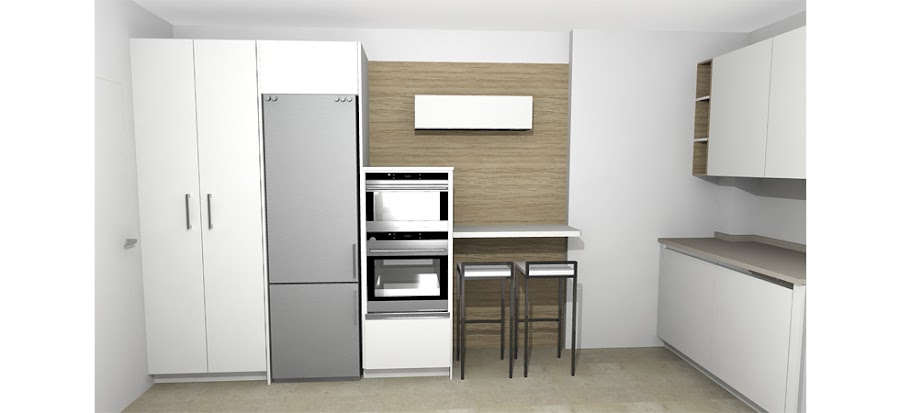 En el otro lineal nos encontramos con dos columnas de 230*40. Una de ellas una despensa con estanterías y la otra un escobero con disposición interior a medida. A continuación le sigue una semicolumna con cacerolero-horno y micro, integrada sobre un fondo de acabado Roble Eilin 1003, que le aporta calidez y diseño al conjunto. Este espacio también se aprovecha para colocar una barra HPL de Baido, resistente a altas temperaturas y fricción de materiales. En la parte alta finalizamos con un auxiliar abatible.
