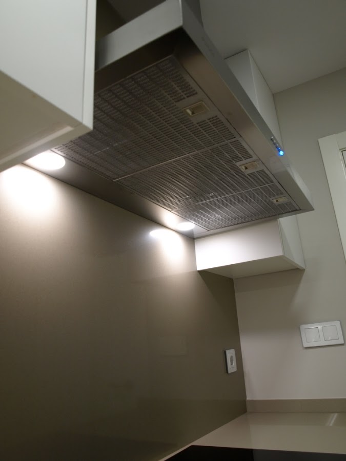 Únicamente se alicataron paredes en la zona de máquinas de lavar y tras la fregadera y lavavajillas por cuestiones de protección de muebles. El resto de paredes se enyesaron y pintaron en un tono arena que se integra perfectamente con el conjunto.