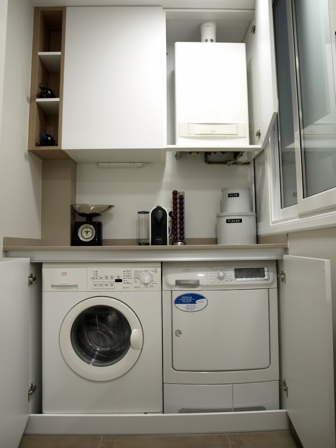 Nos encontramos una cocina dividida del lavadero, donde se encuentran secadora, lavadora y caldera. Todos de libre instalación. Colores oscuros e iluminación insuficiente nos crea una sensación de espacio reducido donde parece muy complicado poner orden.