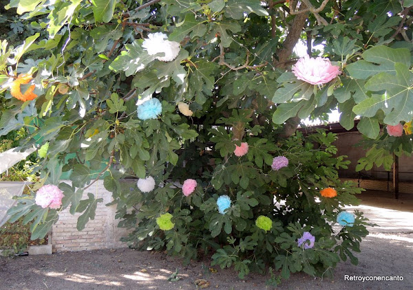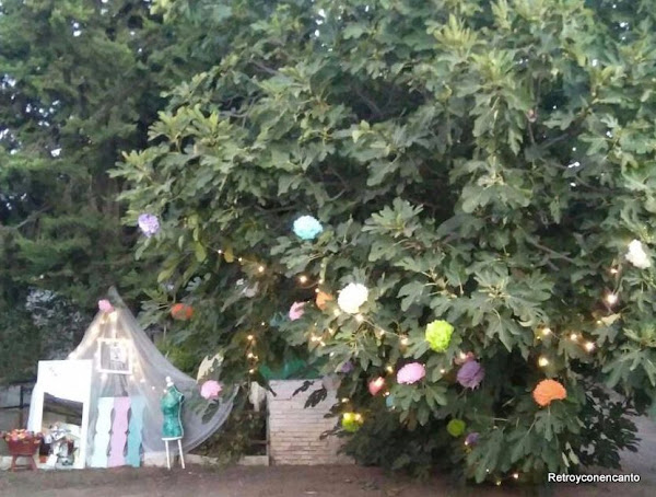 Contábamos con la baza de un espacio familiar donde celebrarlo, presidido por una espectacular higuera que, convertimos en protagonista, con flores de papel de colores y guirnaldas de luces.
