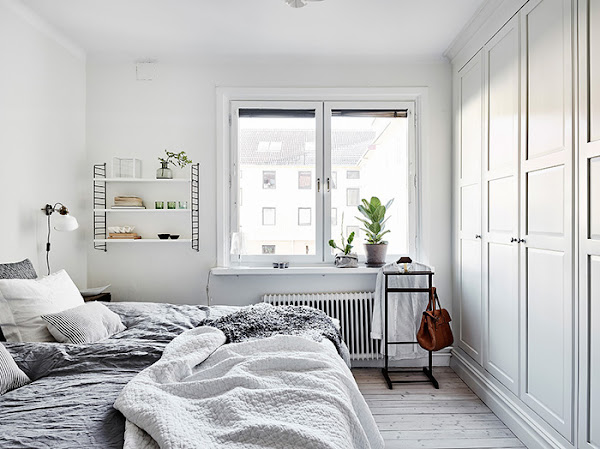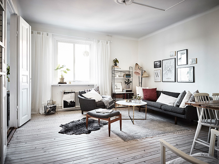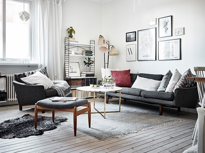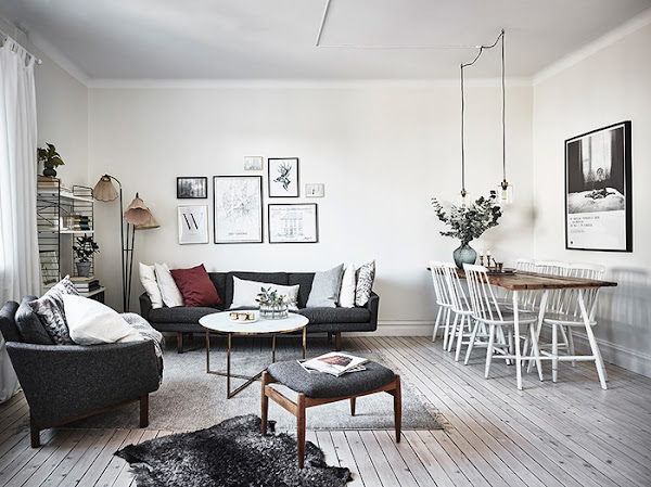 Ese toque sin duda lo da un cojín, si una sencilla funda de cojín lisa de color VINO, BURGUNDY o MARSALA para los amigos, un color que marca totalmente en el salón de este piso escandinavo dándole un toque de calidez y elegancia.