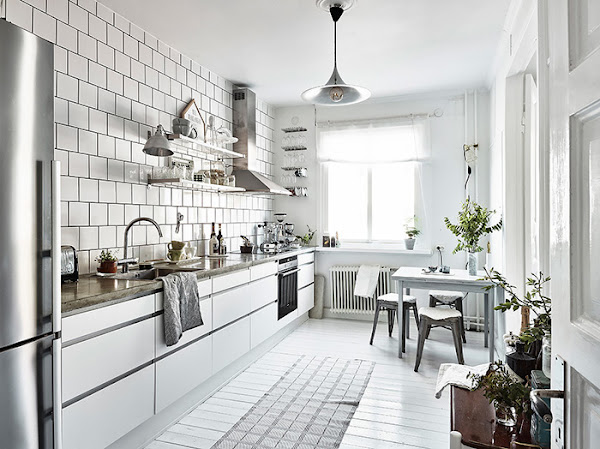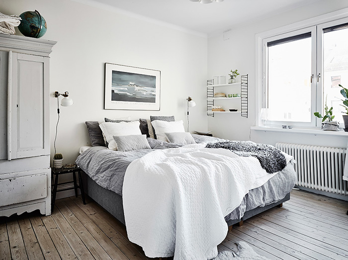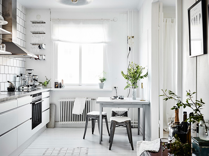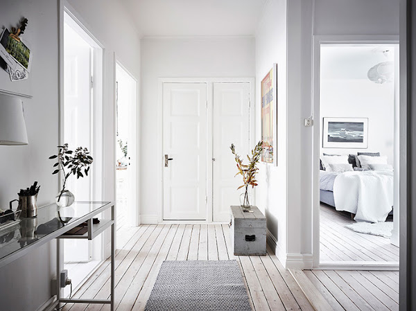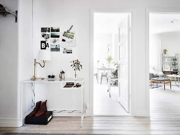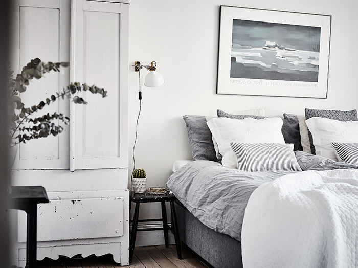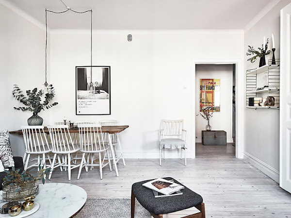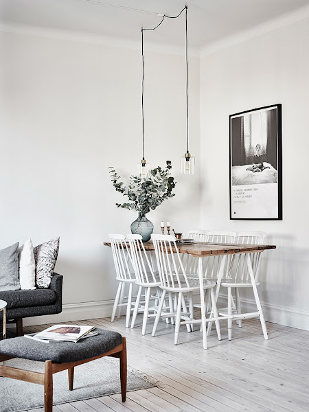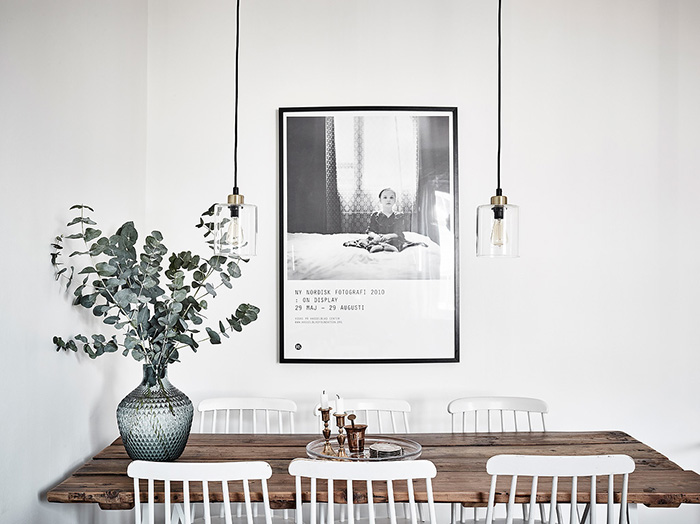 En el resto de la casa se puede ver mobiliario blanco y líneas depuradas. Ideas como composiciones de cuadros y centros de mesa donde las ramas de eucalipto tienen un gran protagonismo, como os decíamos al principio ideas, ideas y más ideas para adaptar en nuestras casas y si te gusta este estilo, estos colores y este aire escandi al final del post hemos dejado una selección de Fichajes Deco.
