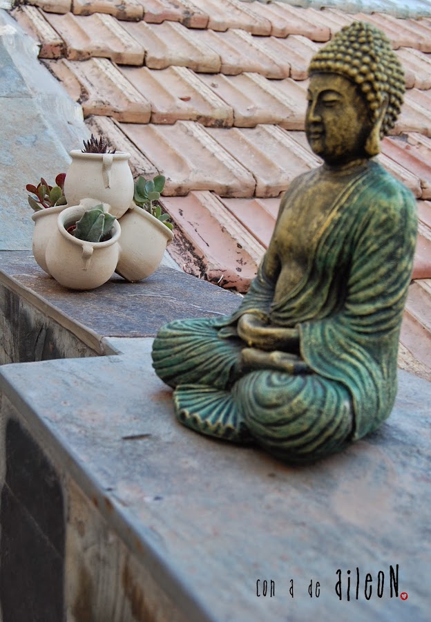 El caso es que en su día compramos tanta, que nos sobró para tapar una pared en la terraza.... Y ahora es un Buda verde y algunas de mis plantitas las que la adornan: