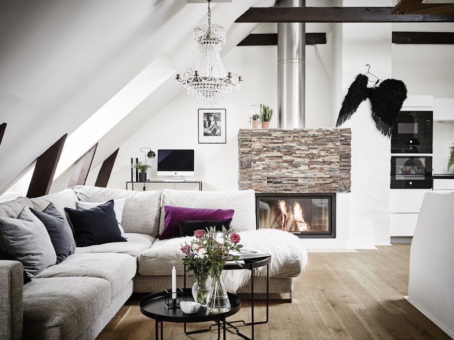 Los detalles que más me gustan del comedor son la lampara de cristal sobre el sofá, la chimenea con el frente de piedra que contrasta con el blanco y el pequeño rincón con la mesa de ordenador. Este ático lo tiene todo!!