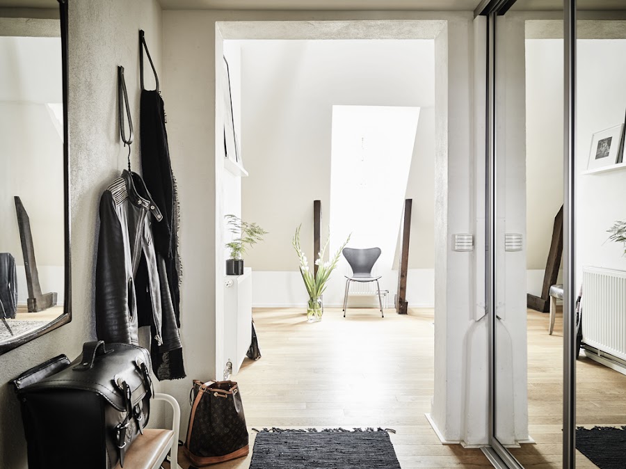 El recibidor tiene todo lo necesario, armario para los abrigos, espejo y colgador y una banqueta para descalzarse. ¿Quién ha dicho que no se puede tener todo en un espacio pequeño?