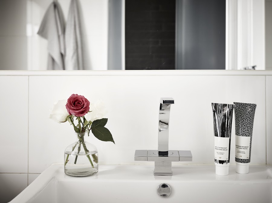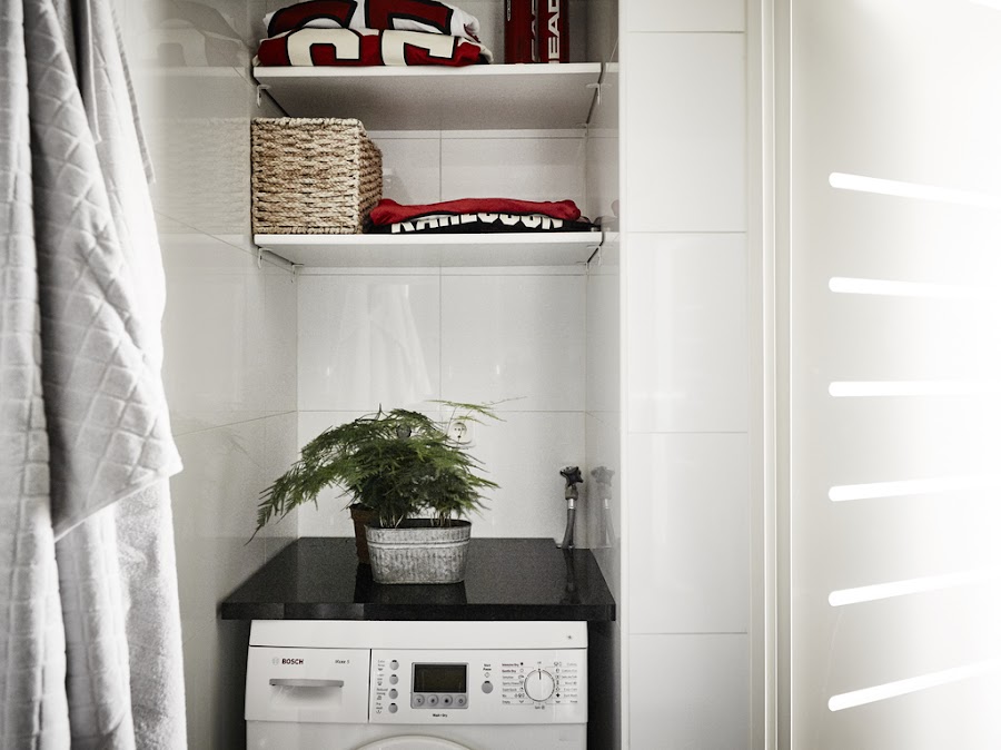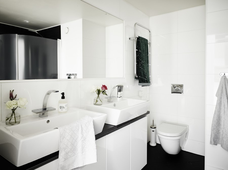 En el baño blanco y negro, aire clásico pero a la vez minimalista, como el estilo de la cocina. Tiene hasta lavabo doble y espacio para la colada.