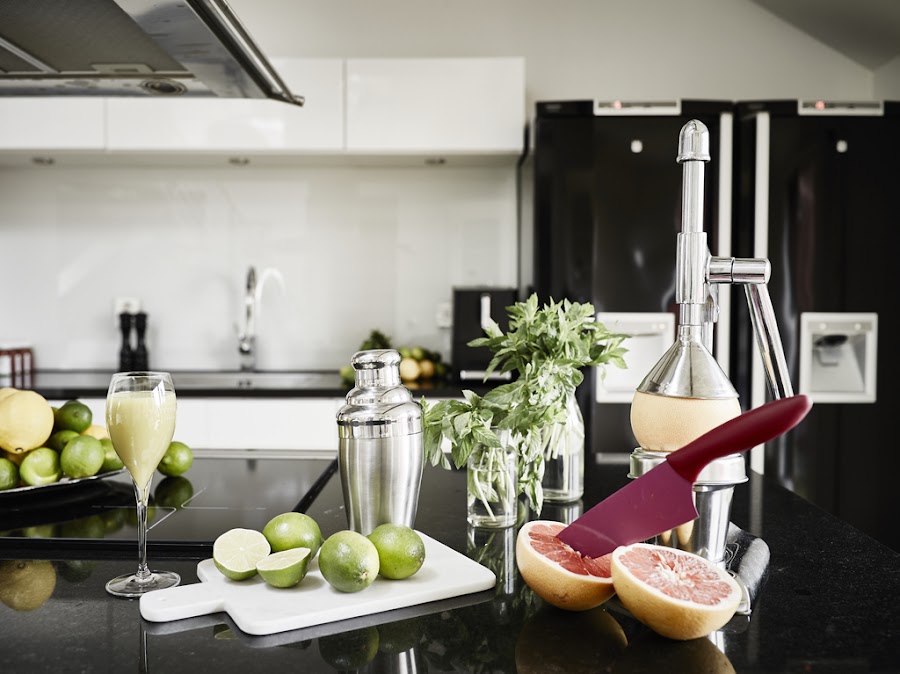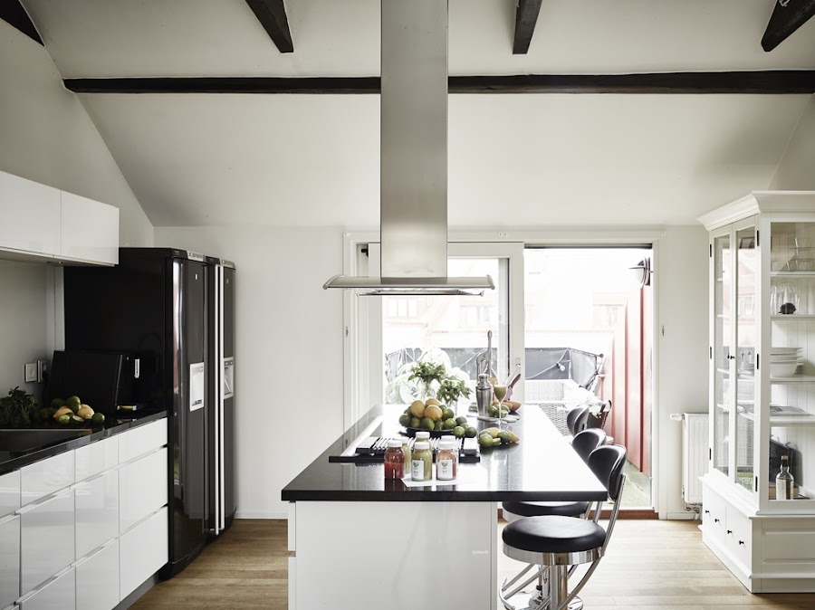 La cocina es impresionante. Tiene un carácter clásico con los muebles blancos, mármol negro y el mueble aparador blanco. Pero mantiene la frescura con las lineas limpias de los muebles con ese aire más minimalista. Que gusto cocinar aquí!! Además tiene acceso directo a la terraza!!