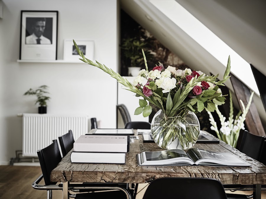 En el comedor resalta el papel pintado del fondo, la alfombra bajo la mesa y las fotografías en blanco y negro. El conjunto creado por la mesa, con ese maravilloso sobre de madera y las sillas de perfil de acero y las eames negras en los extremos, crea una atmósfera muy elegante sobre la alfombra de corte más clásico y el arreglo floral.