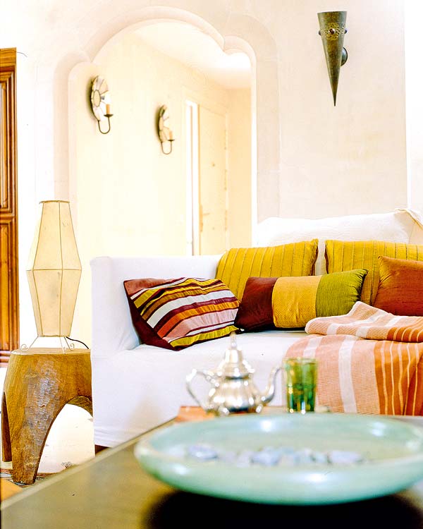 Colores primaverales que aportan luminosidad y calor a los tradicionales salones... el toque final lo ponen los preciosos cojines de seda.