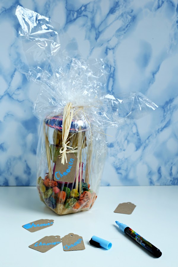 Los nombres de los destinatarios con rotulador para tela e hilo de fibra