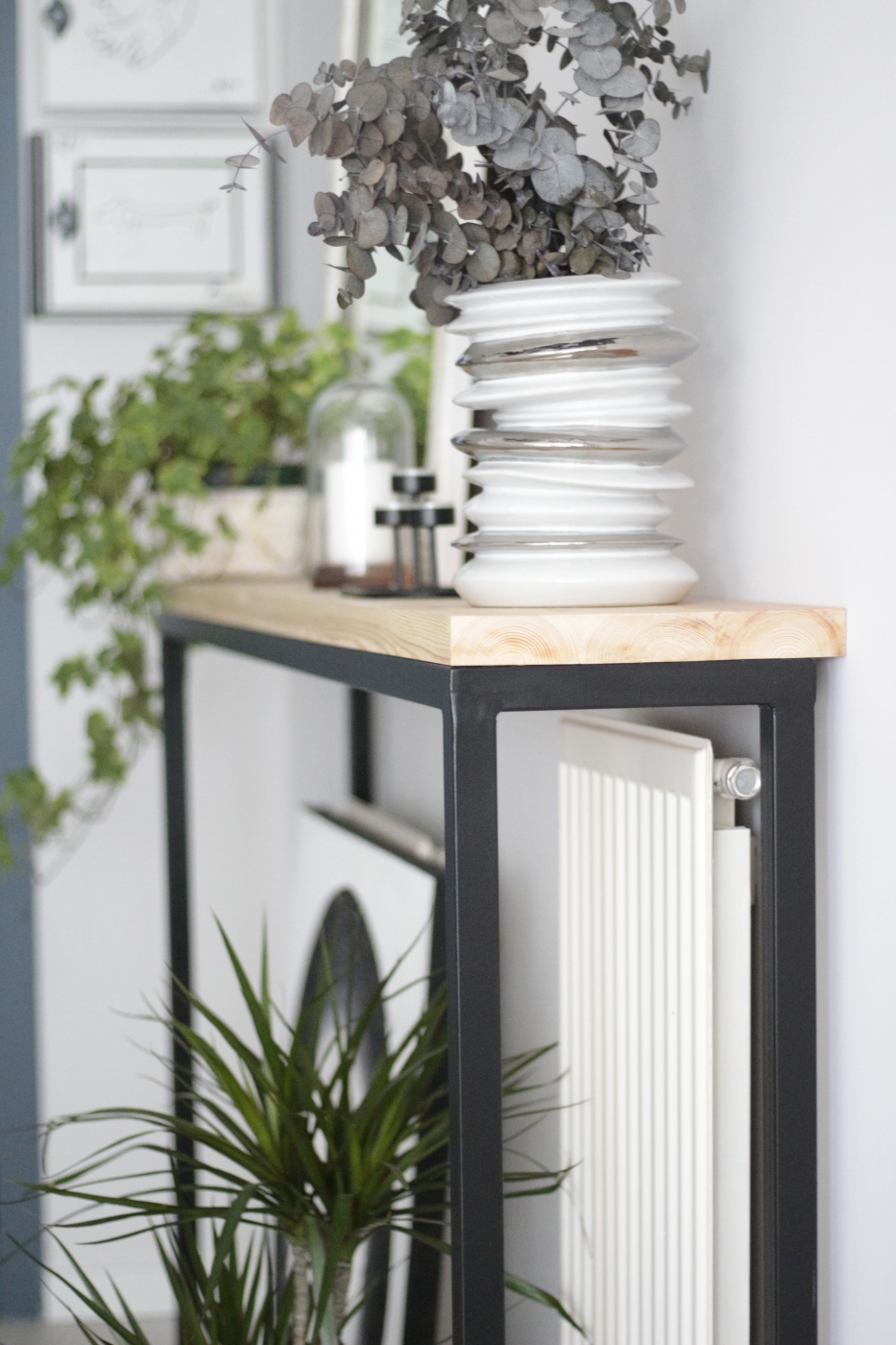 De momento os dejo con las imágenes de nuestro primer trabajo combinando estos dos materiales, esta preciosa consola realizada a medida para encajar los dos radiadores de la entrada a la vivienda. Para la encimera utilizamos una madera de pino de Soria, una madera súper resistente y con una beta espectacular.