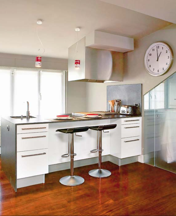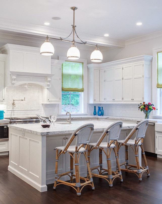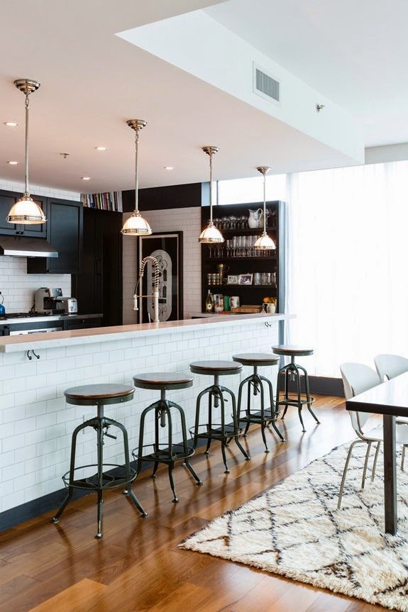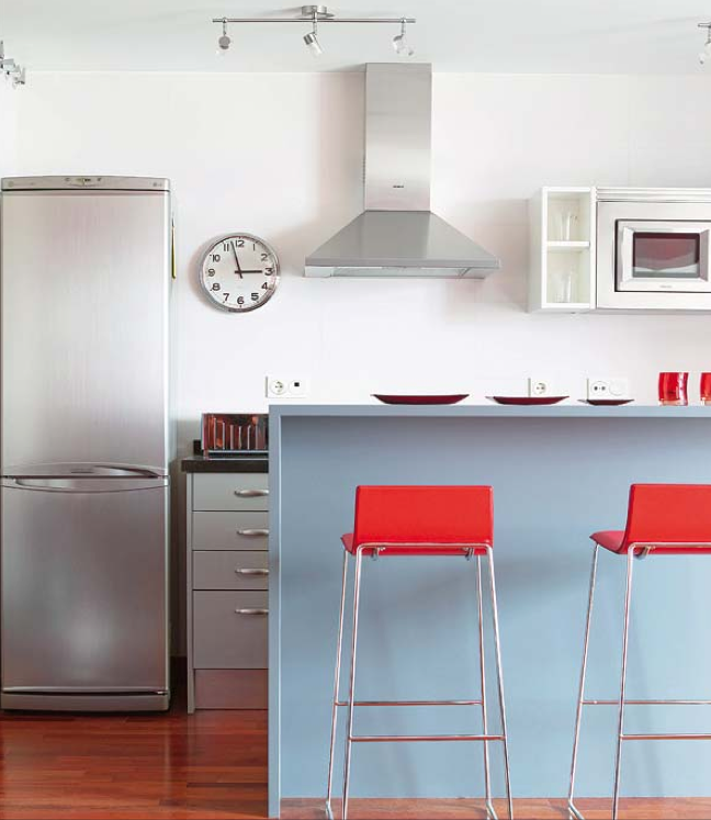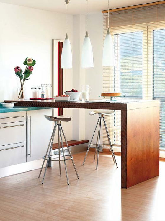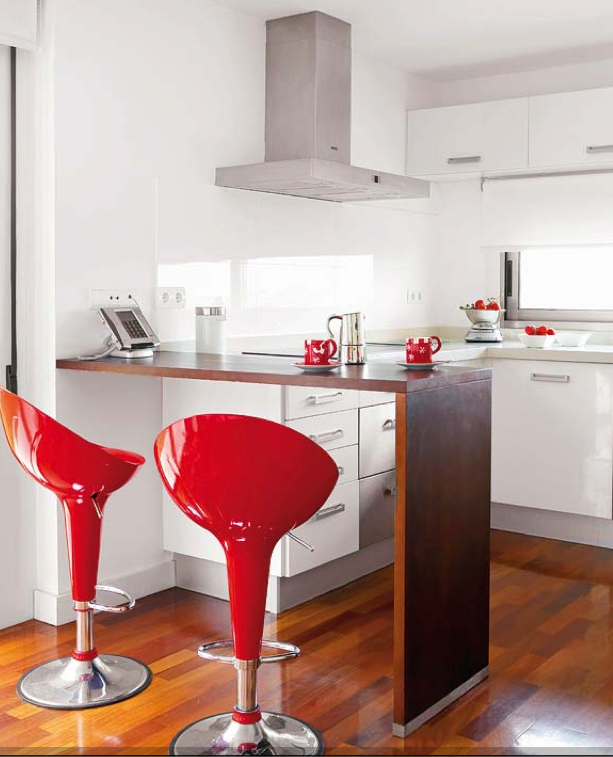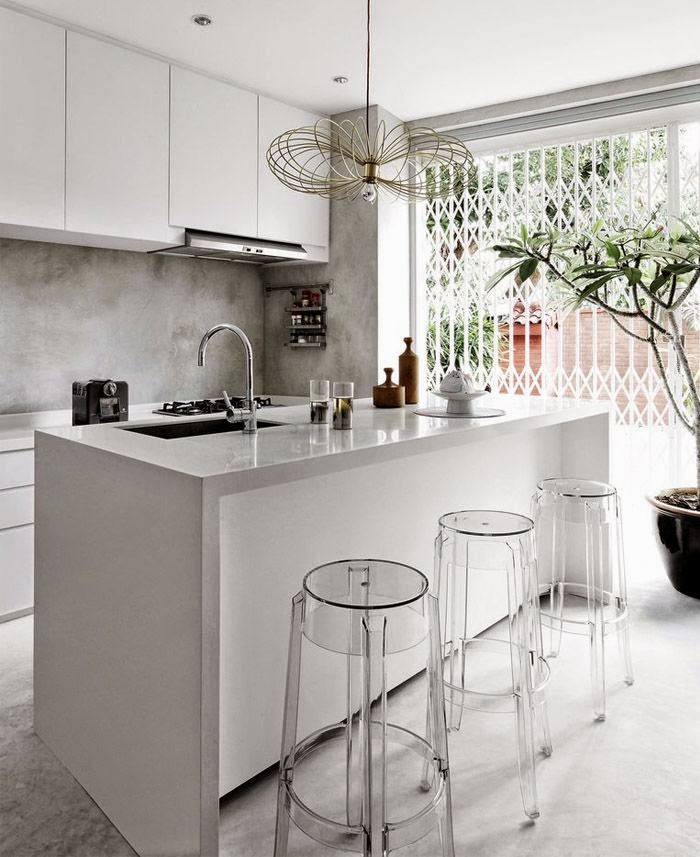 Hoy en día la mayoría de las cocinas tienen habilitadas barras para desayunar o para comidas rápidas, suelen ser zonas en las islas y/o penínsulas, generalmente lo primero que se busca que sean funcionales, cómodas y por supuesto aprovechar al máximo el espacio. Otra de las claves para que estas zonas se empleen al 100 x100 es que las sillas altas y los taburetes se adapten perfectamente al tipo de mesa, encimera o balda que haga las veces de barra. Modelos de taburetes hay cientos, yo diría que para todos los gustos y bolsillos, podemos encontrar desde elegantes diseños con estructura de tubo de acero cromado, los clásicos de madera y tapizados, los de estilo retro industrial, los de fibras naturales como el mimbre ó el ratán, incluso coloridos taburetes de polipropileno...o transparentes como los de la imagen de abajo, en fín que para gustos "los colores".
