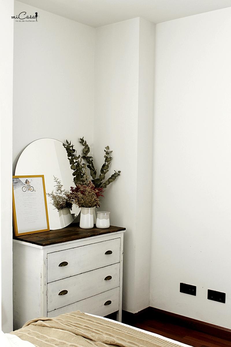 Me ha llamado también la atención la cómoda del dormitorio, una sencilla cómoda de Ikea a la cual le han dado un toque personal ellos mismos. Le hicieron un sobre con tablas de madera, pintaron y decaparon el cuerpo de la pieza entero y cambiaron los tiradores. Con todo ello le dieron un aspecto más añejo del que tenía la cómoda original.