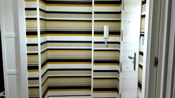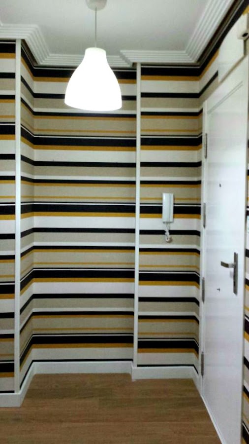 Como veis la entrada se empapeló totalmente, de arriba a abajo y con la raya en horizontal. El contraste con las puertas - tanto de entrada como interiores - y los esquineros de madera blanca le da el toque perfecto.