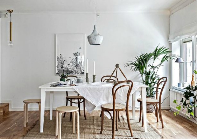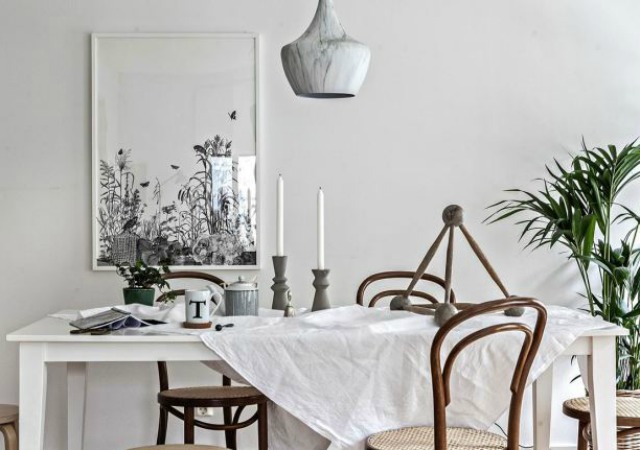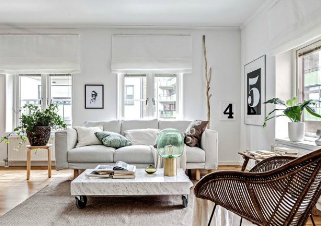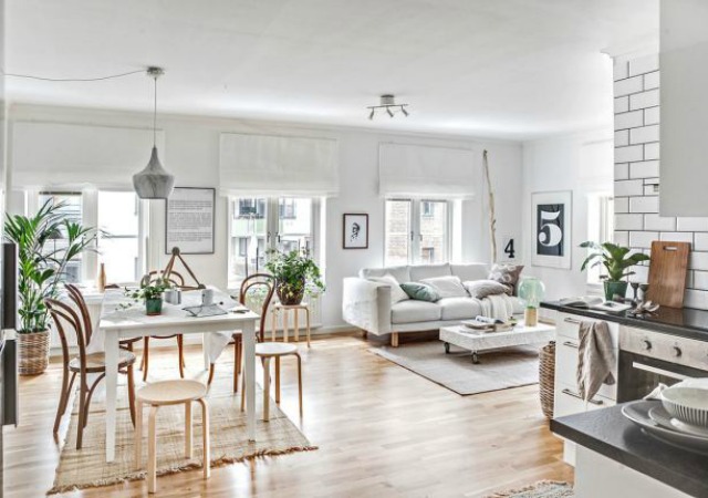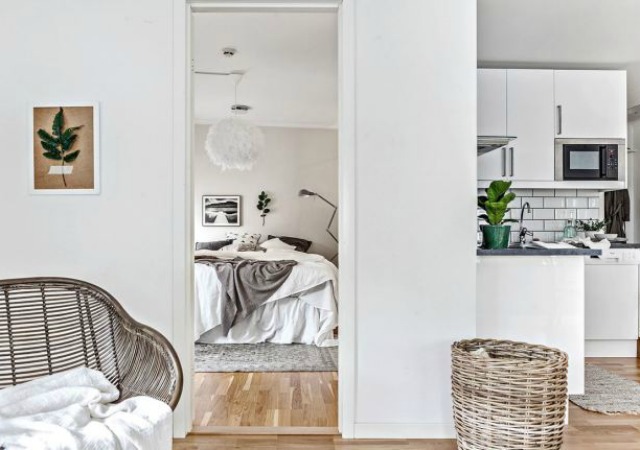Este pequeño apartamento nórdico de 49 m2 esta decorado con una preciosa paleta de colores claros; blancos y cremas aderezados con sutiles verdes. Lo que todavía le hace mas encantador es la utilización de materiales naturales como el cáñamo, rattán, lino, algodón o madera entre otros. Un ambiente inspirador cálido y sereno lleno de luz y vida, que se enfatiza aún mas con el frescor de las plantas.