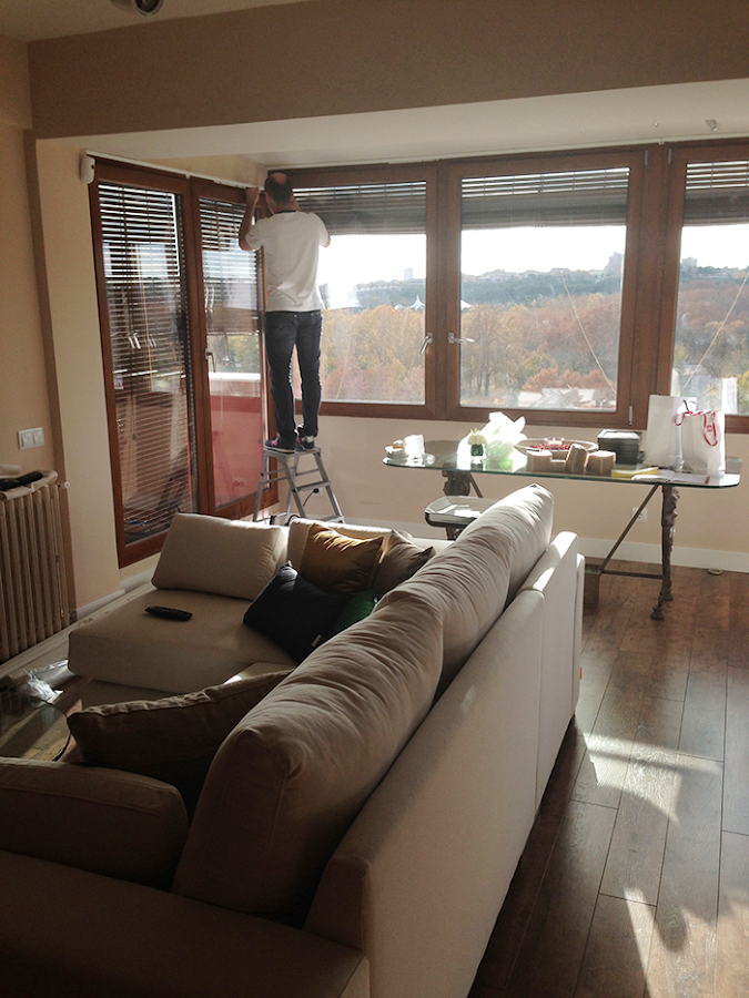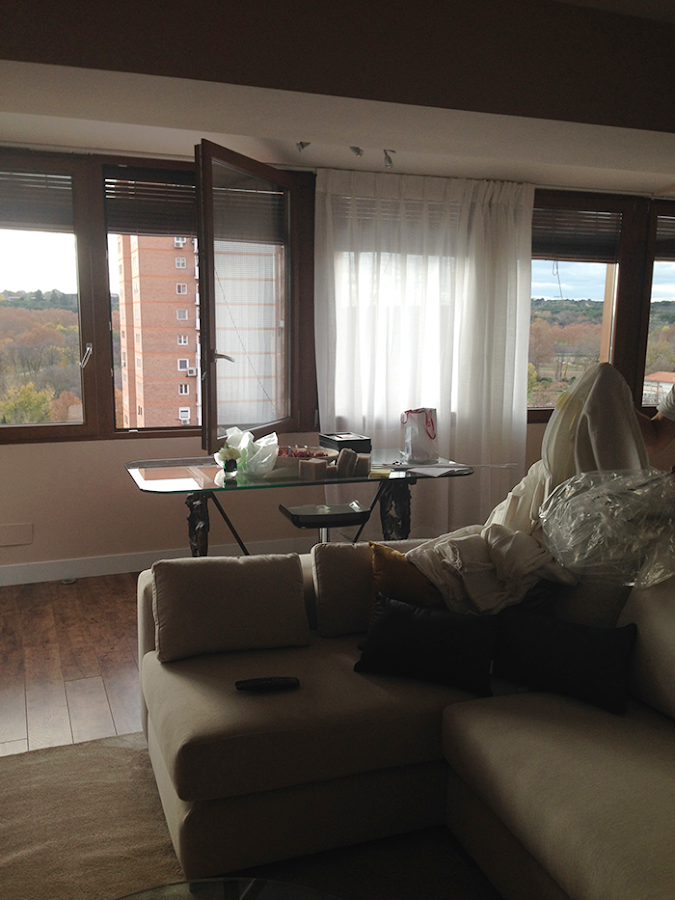 Los visillos de lino con efecto arrugado era la mejor opción para adornar los enormes ventanales de este ático, así que estos, también los pusimos en marcha.