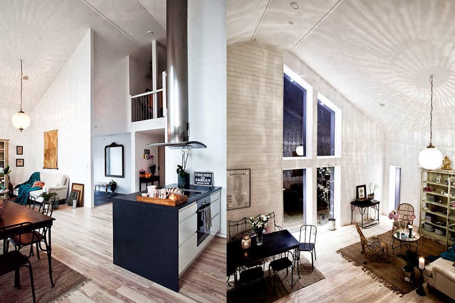 Techos altos y ventanales a diferente nivel convierten el salón-comedor-cocina en un espacio luminoso