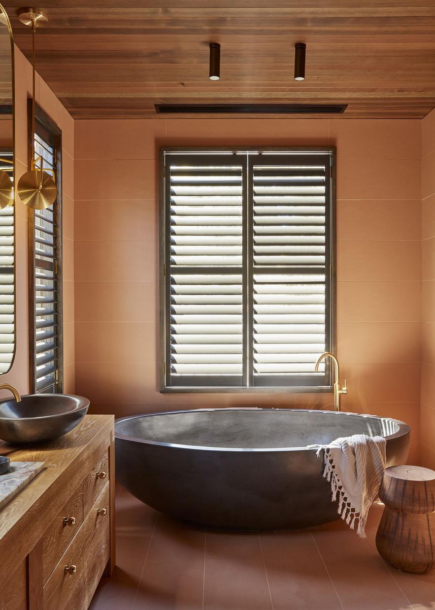 La planta superior se extendió permitiendo así, crear en ese primer piso, una suite de invitados y en la planta inferior un gran porche contiguo al salón desde donde contemplar las vistas a la naturaleza, las montañas y los viñedos. En la primera planta sin duda destaca el baño, el color terracota lo hace muy cálido y acogedor aportando un plus, el techo de lamas de cedro y el mobiliario de madera, el punto elegante y sofisticado lo aportan los toques de latón en espejo, grifería y apliques, y la guinda del pastel se la da la piedra negra de la bañera y el lavabo. Sin duda el baño, no puede ser más bonito.