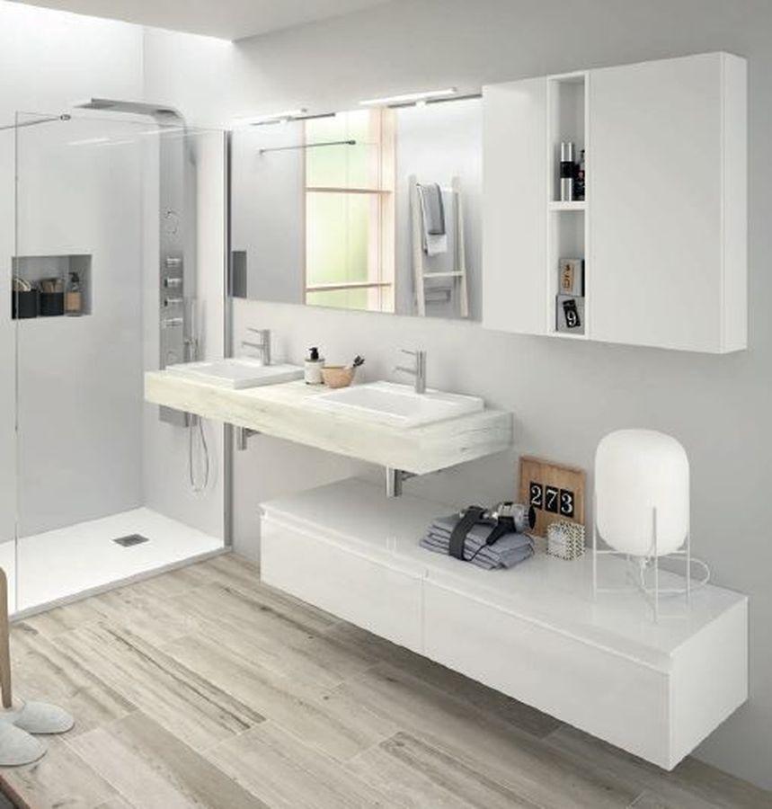 En esta foto podemos ver como la encimera en acabado piedra gris hace que la estancia adquiera un aire completamente elegante. En la parte inferior del baño hay un mueble con dos cajones de la colección Monterrey complementado con un mueble auxiliar colgado.