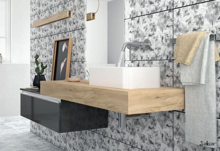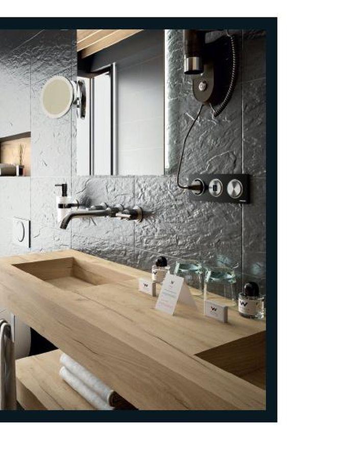 La madera también es perfecta para el baño. Un ejemplo es la encimera Compakt en acabado roble áfrica de Salgar. Combinada con una repisa y textiles del mismo acabado, sobre la encimera se han colocado dos lavabos de porcelana blanca con un grifería en negro mate. Todo un juego de contrastes con un par de toalleros Compakt a juego con la grifería y espejos de aumento.