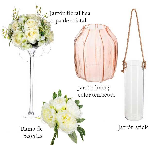 Para decorar la mesa principal del salón comedor, con nuestro jarrón floral en forma de copa de cristal de la gama Lisa pondrás un toque bello y delicado. Para conseguir el look coloca dos jarrones, uno a cada extremo de la mesa. Otra opción son nuestros ramos de 4 flores peonias en color blanco. Unas flores tan conseguidas que casi parecen reales. Coloca estos ramos en los jarrones living color terracota fabricados en vidrio y con el que darás un toque de elegancia y distinción. O también en nuestro florero stick, que puedes poner sobre la mesa o colgarlo en cualquier rincón, ya que tienen una cuerdecita.
