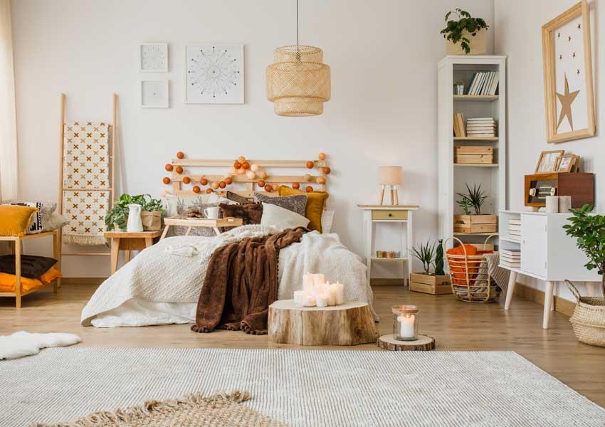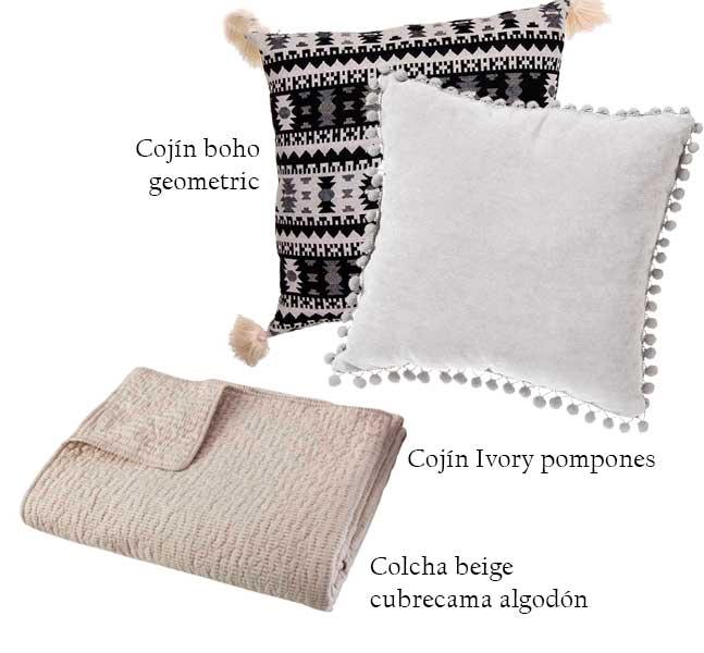 Lo primero es empezar por la cama ya que es el elemento principal en nuestra habitación. La elección de la ropa de cama y los cojines es la más importante, ya que los tejidos visten tu hogar y aportan diseño y calidez. Las fundas cubrecamas fabricadas en algodón de calidad son ideales ya que aportan un toque de elegancia gracias a su color beige. Para conseguir el look de la foto combina cojines de diferentes estilos como el cojín boho geométrico con unos originales pompones en las esquinas o el cojín Ivory fabricado con unos originales pompones alrededor que podrás encontrar en gris y en blanco. Puedes completar con una manta de algodón trenzado en color crema que además de ser muy calentita es muy original.