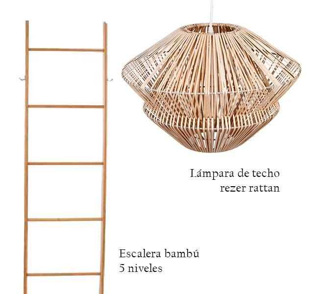 Coloca una escalera de bambú junto a la cama. Es muy práctica para dejar la ropa o para colgar alguna manta o incluso para poner tus pañuelos y bufandas. Coloca una lámpara de techo Rezer fabricada en rattan de diseño vanguardista y de gran calidad y estética. En nuestra tienda online además encontrarás una gran variedad de lámparas de techo de estilo similar.