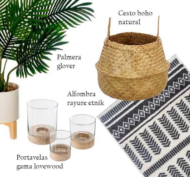 Para completar esta decoración, es imprescindible una iluminación tenue y mágica que podrás conseguir con este precioso sets de 3 portavelas de la gama lovewood. Su estructura en vidrio y su base en madera hace que sea todo un placer tener estos portavelas como complementos. Para terminar es necesaria una buena alfombra. Puedes elegir entre una amplia gama de estilos y diseños y tamaños. A nosotros nos encanta la alfombra rayure etnik de gran tamaño y suave tacto, con la que darás un toque étnico con su original textura basada en las cenefas africanas. Para terminar coloca guirnaldas de luces, plantas artificiales, cuadros de fotografías en blanco y negro y cestos de mimbre.