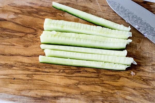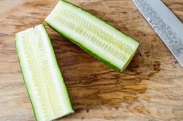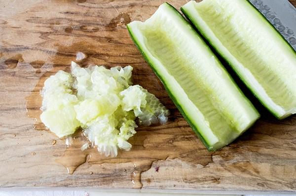 Partimos por la mitad el pepino y con la ayuda de una cuchara retiramos las pepitas, cortamos las mitades en bastones y luego en cubitos pequeños. Lo añadimos.