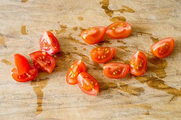 Cortamos los tomates cherry en cuartos con la ayuda de un cuchillo de sierra. Los añadimos.