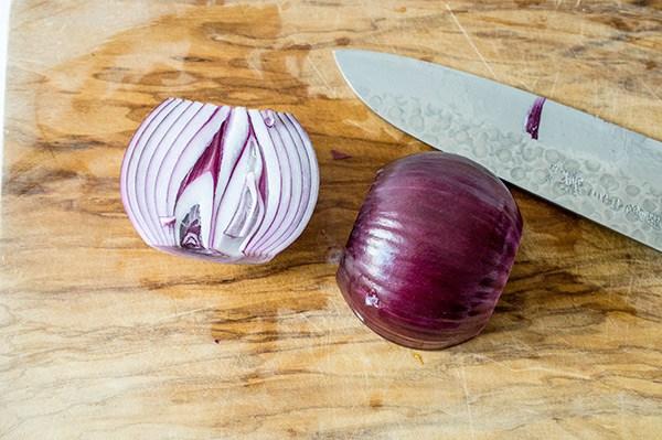Pelamos y picamos finamente la mitad de una cebolla roja.