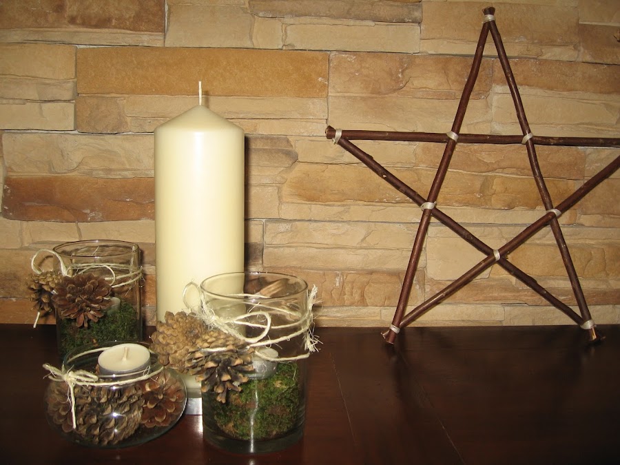 En la imagen inferior un centro de velas totalmente handmade , aprovechando portavelas y elementos naturales como las piñas y el musgo que recogimos una mañana de paseo por el monte...